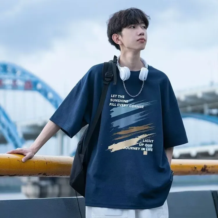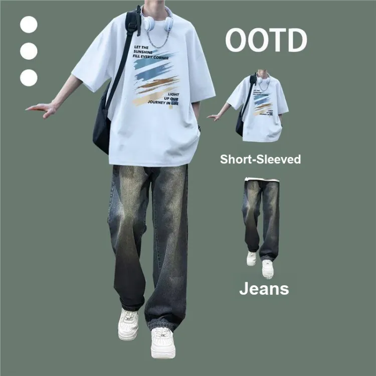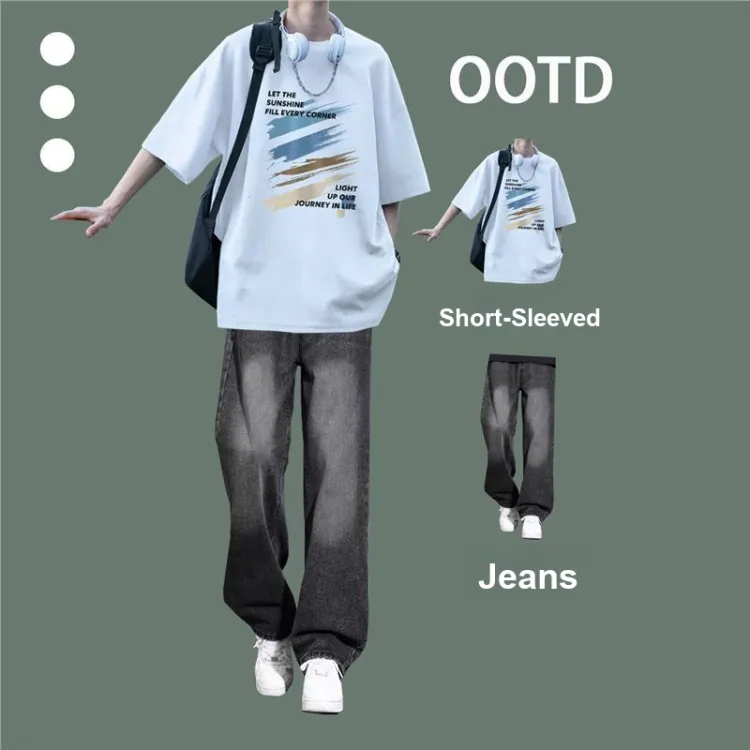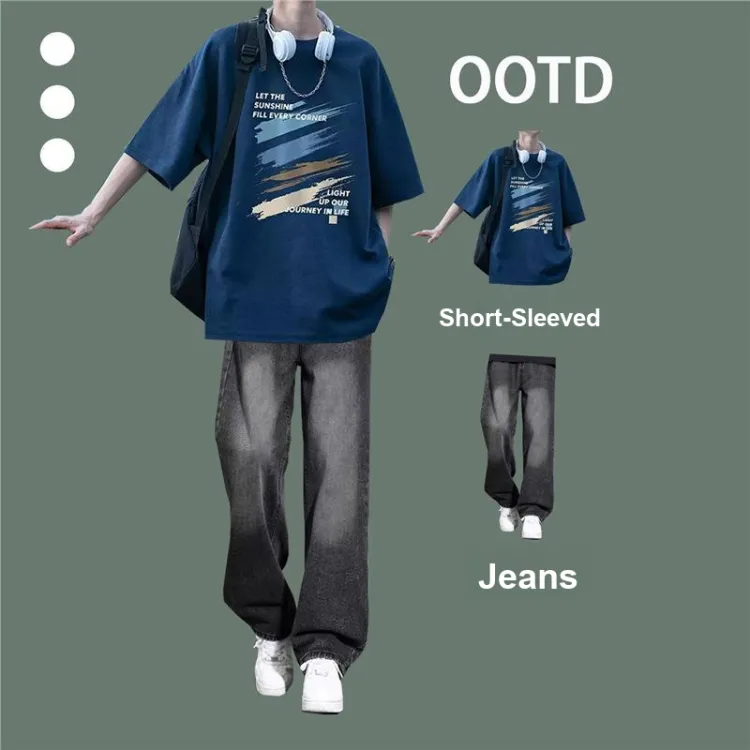 Темно-синий синий с короткими рукавами + серые джинсы