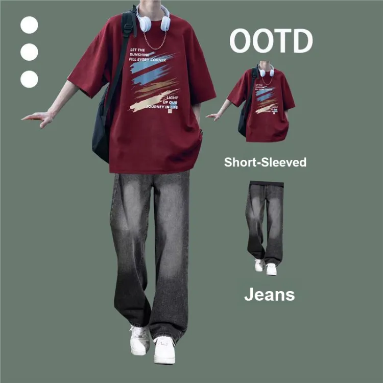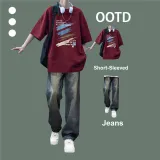 Цвет:Бордовая рубашка с коротким рукавом + синие джинсы