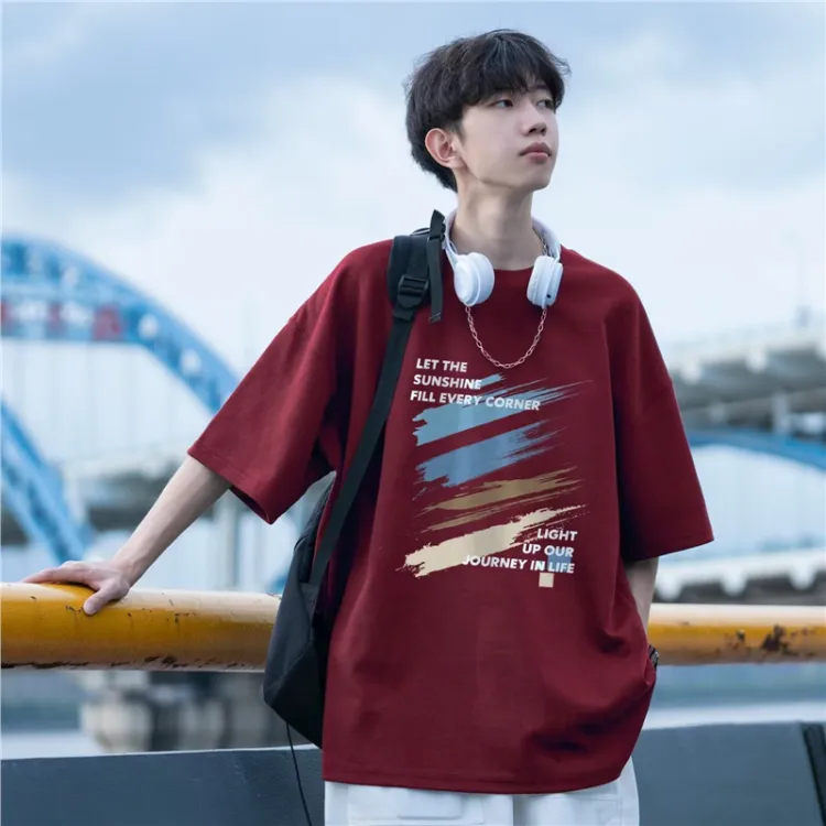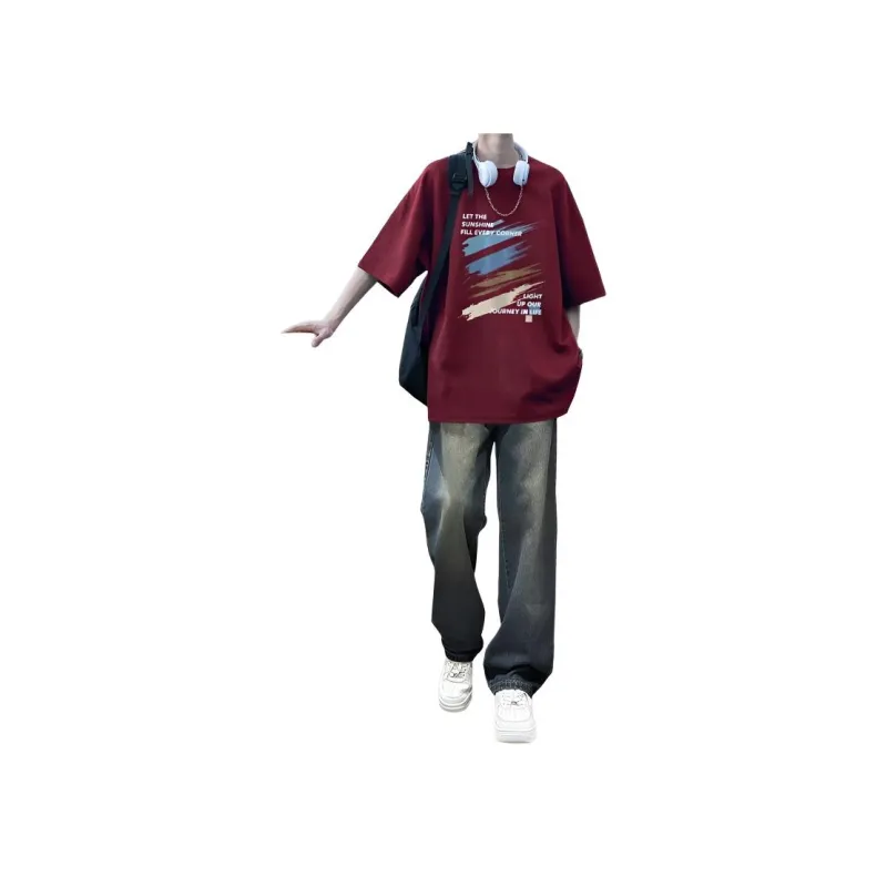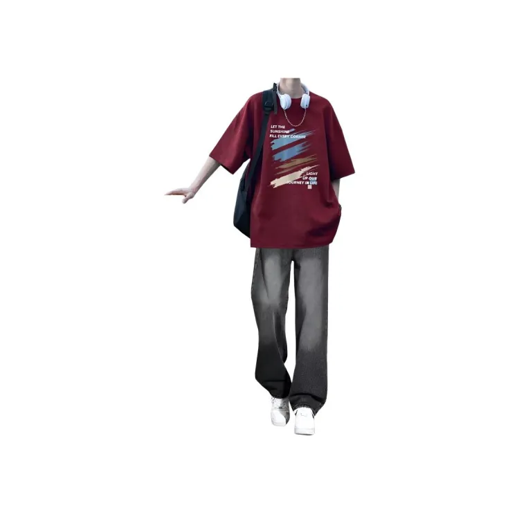 Бордовый с короткими рукавами + серые джинсы