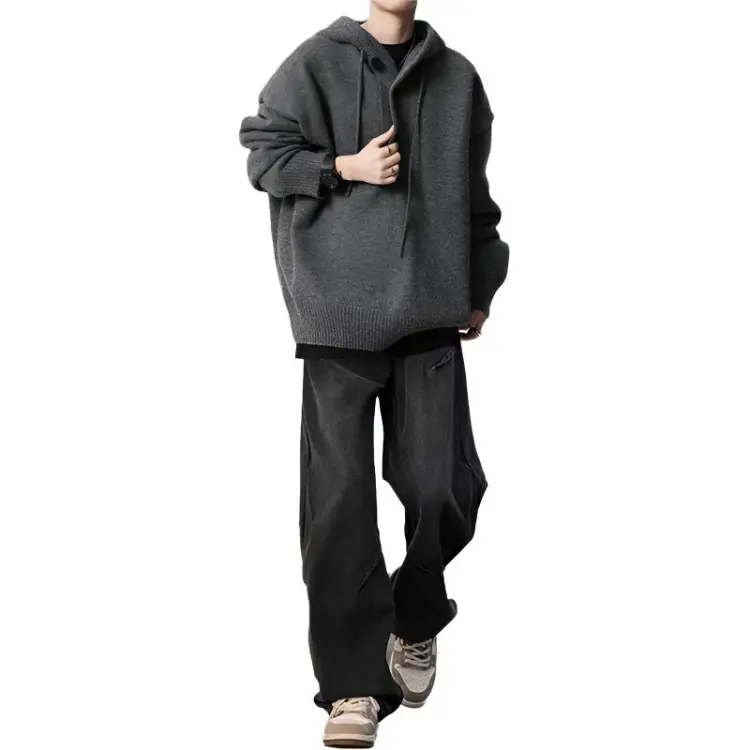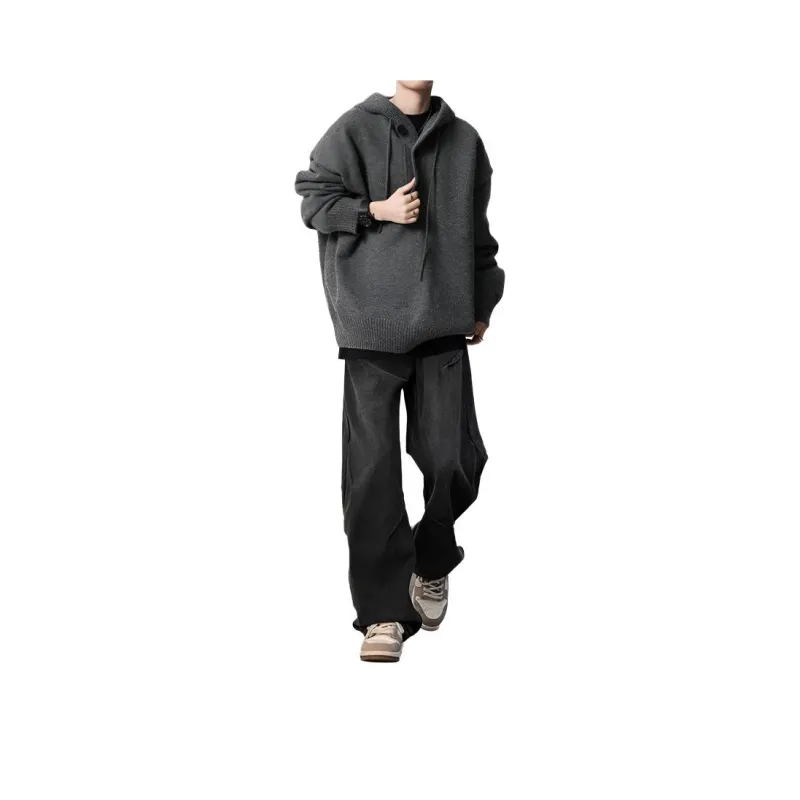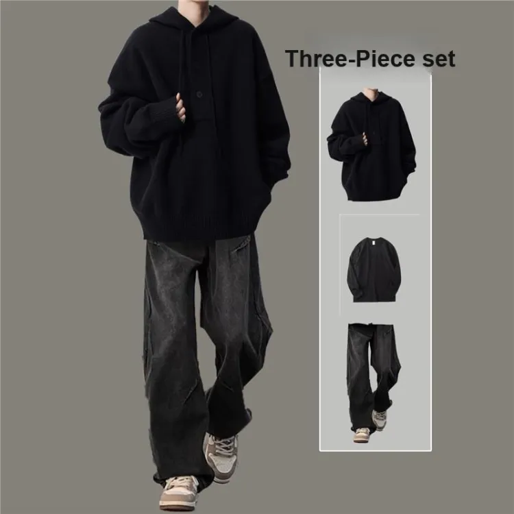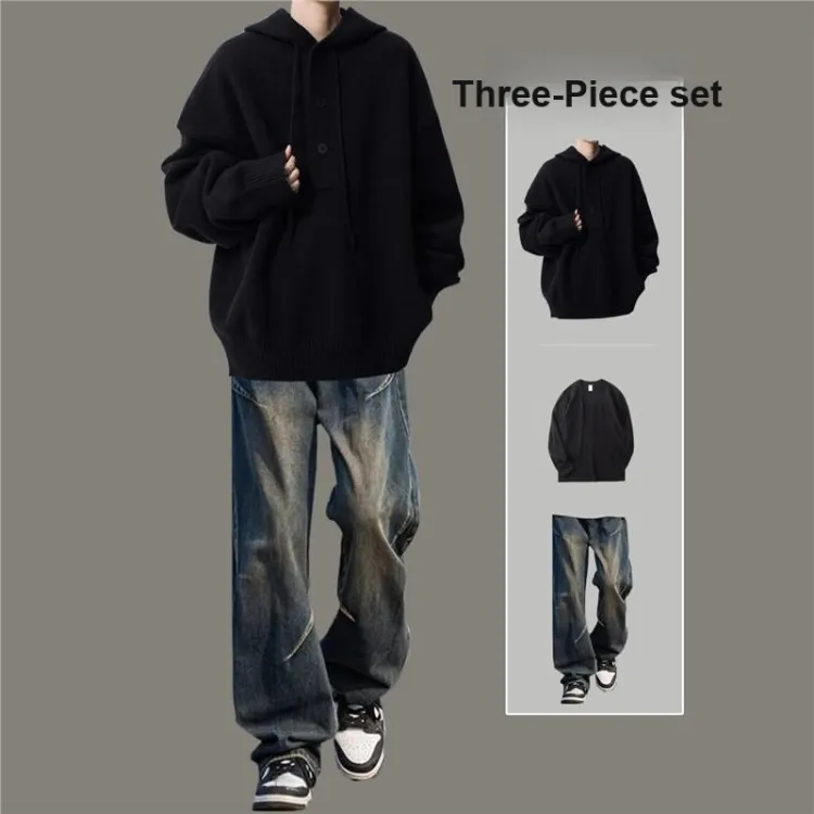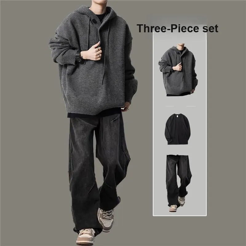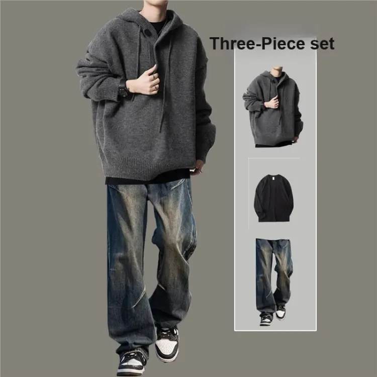 Комплект:Трехкомпонентный комплект: С капюшоном серый свитер + черно-серые джинсы с складками + черная внутренняя одежда
