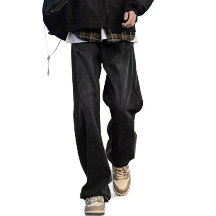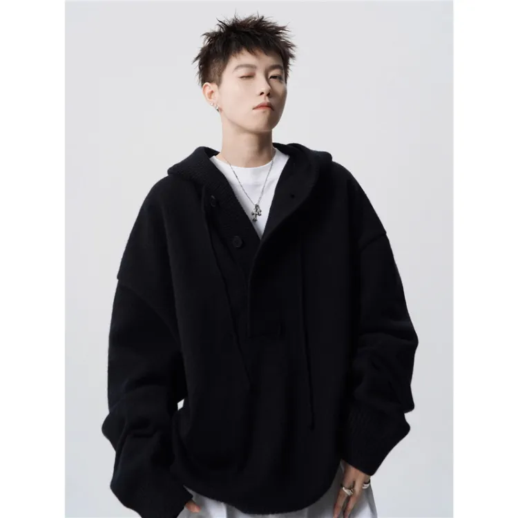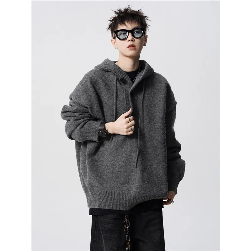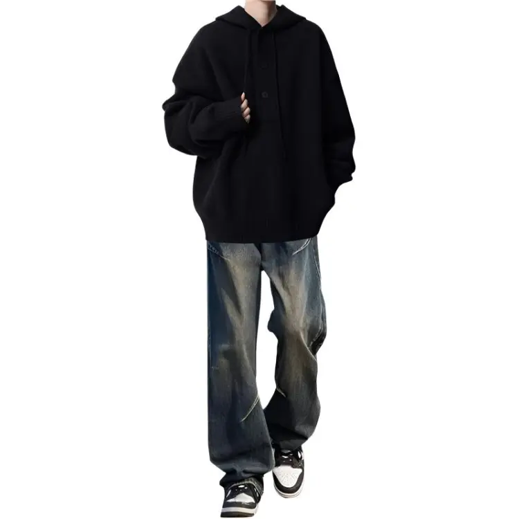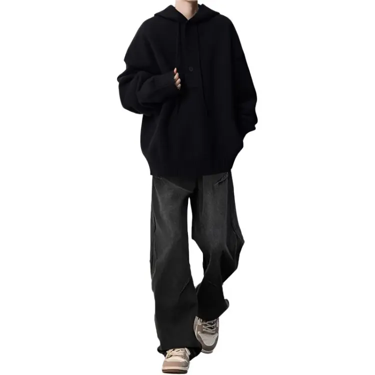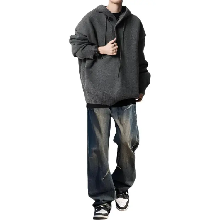 Комплект:Трехкомпонентный комплект: С капюшоном серый свитер + черно-серые джинсы с складками + черная внутренняя одежда