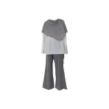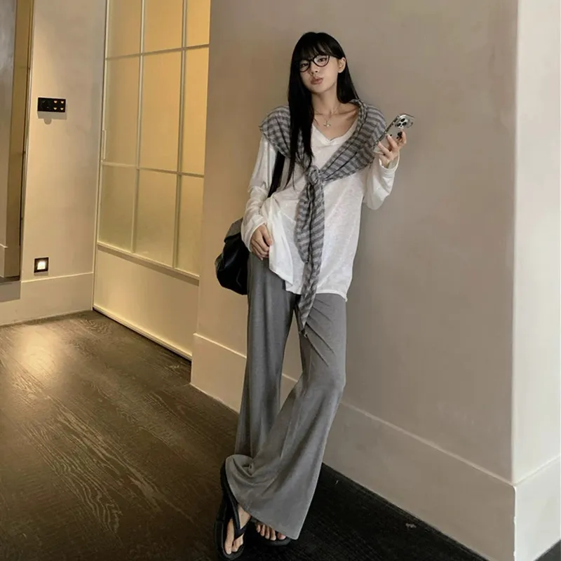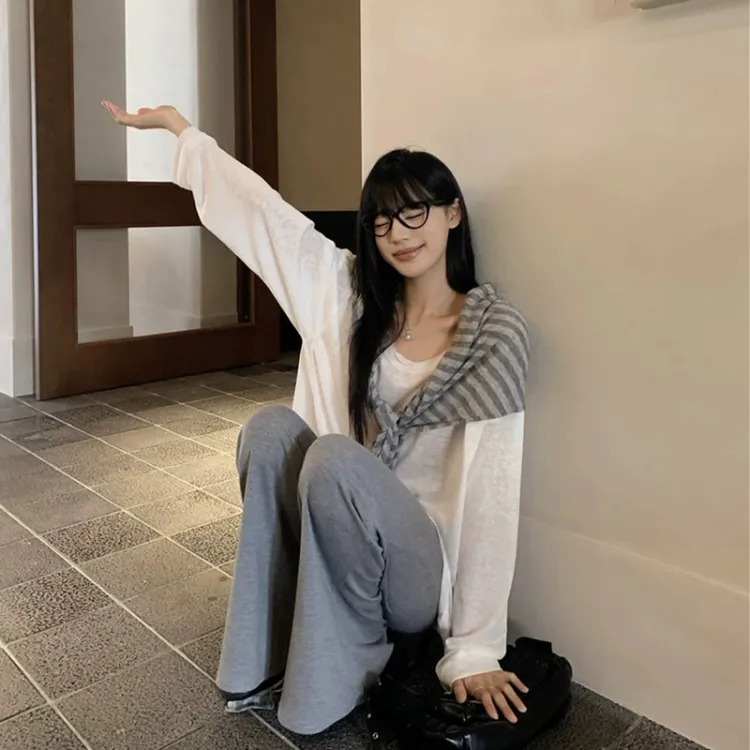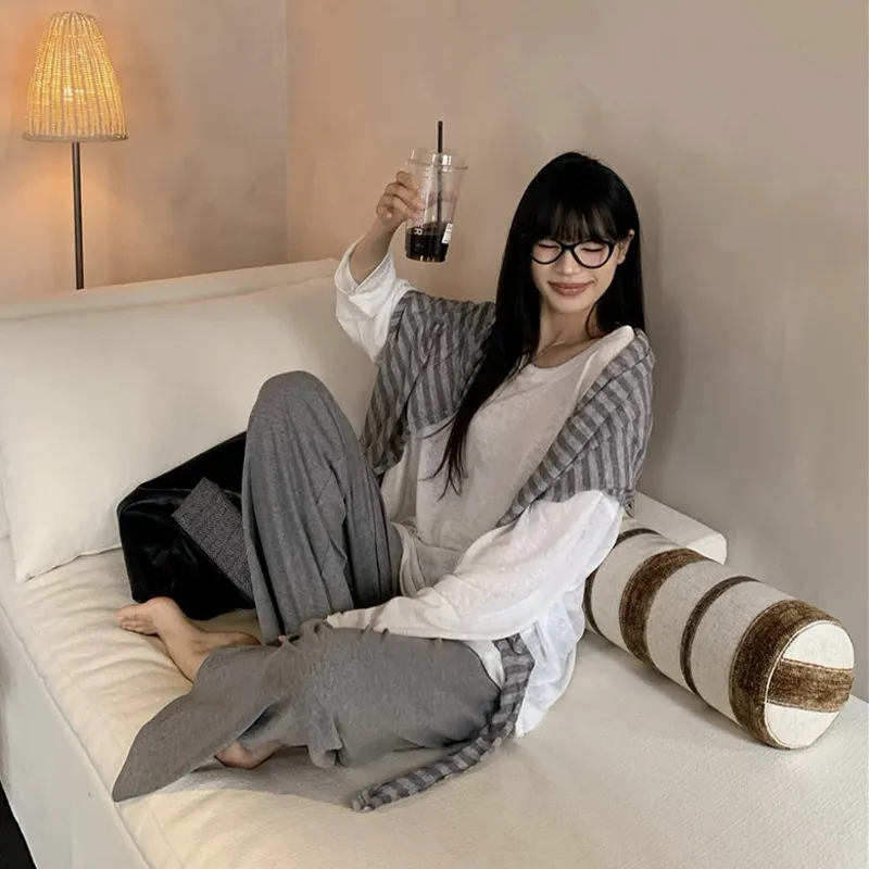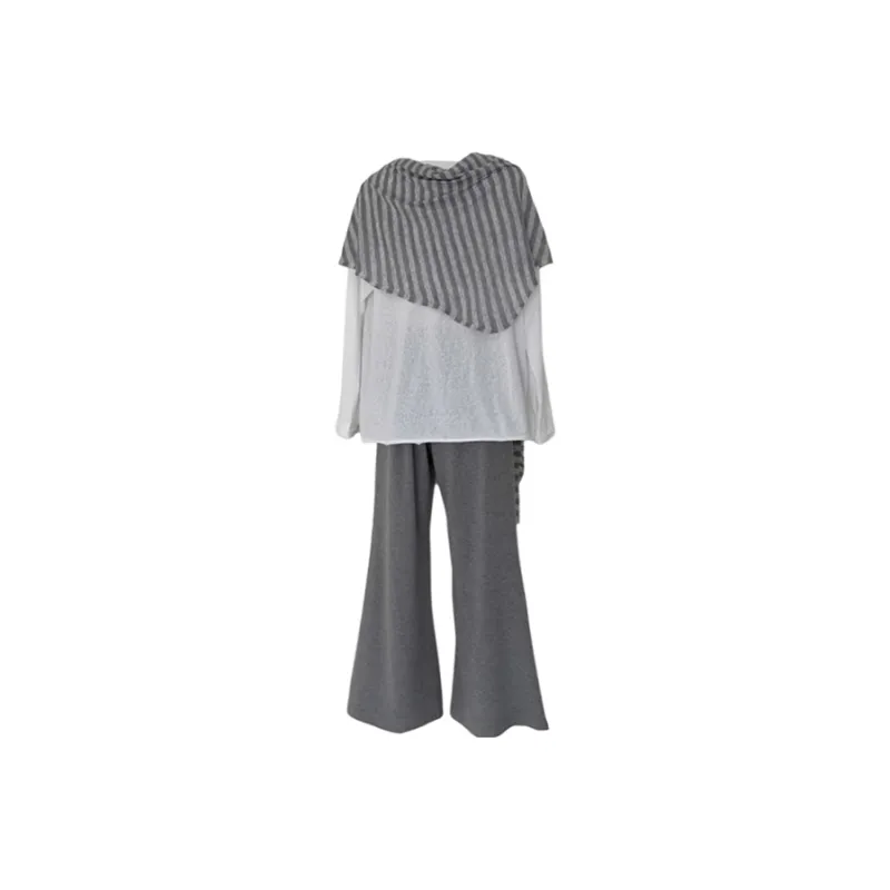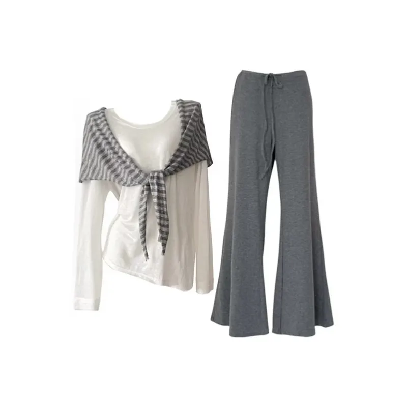 Комплект:Белый длинный рукав топ + полосатая шаль + серые штаны