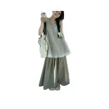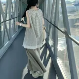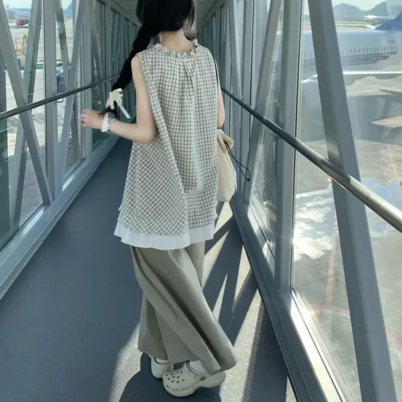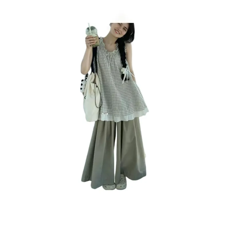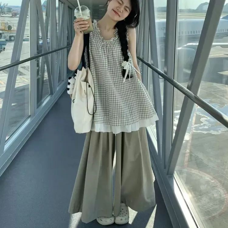 Комплект:Клетчатый топ + однотонные широкие штаны