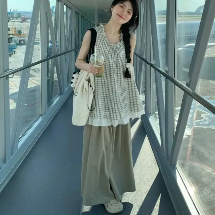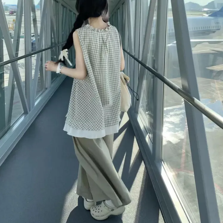 Клетчатый топ + однотонные широкие штаны
