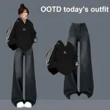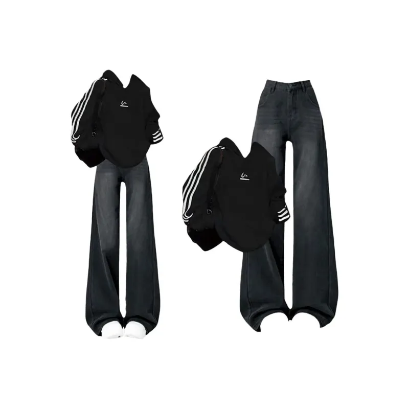 Комплект:Комплект одежды (Три полосы Черный Свитшот + Черные Серые Широкие Джинсы)