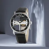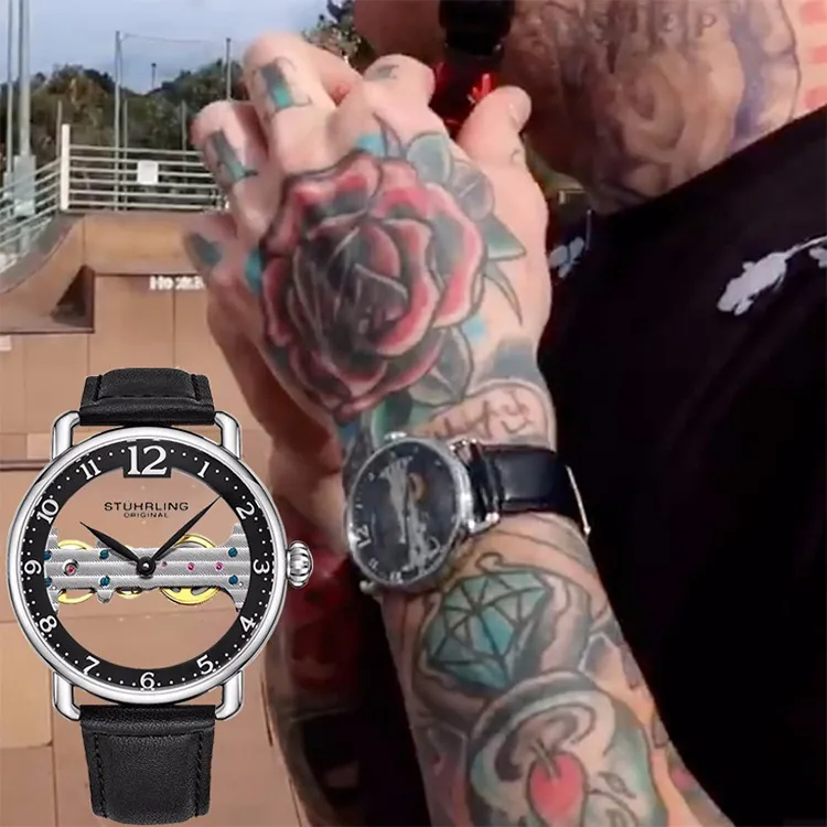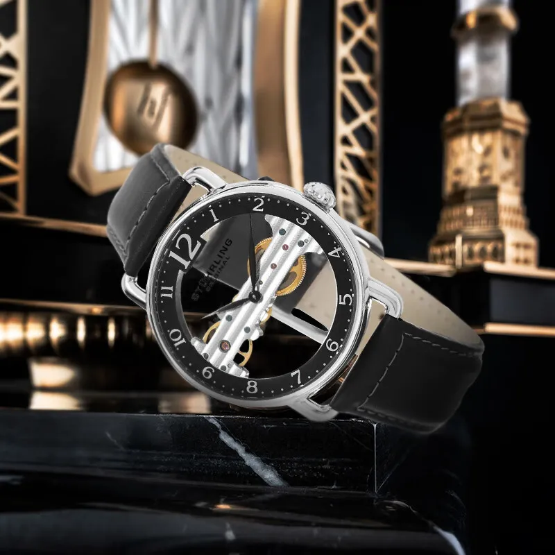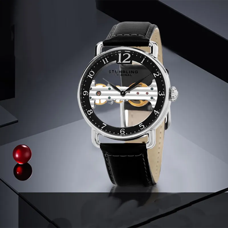 STUHRLING Мужские прозрачные часы Наручные часы с ручным заводом Кожаный ремешок Черный циферблат Мужские часы