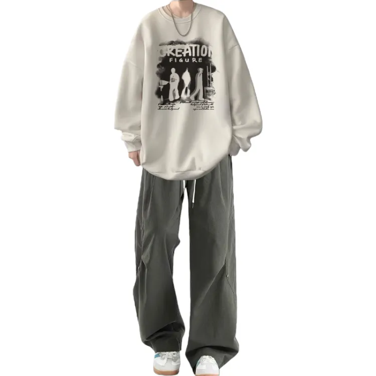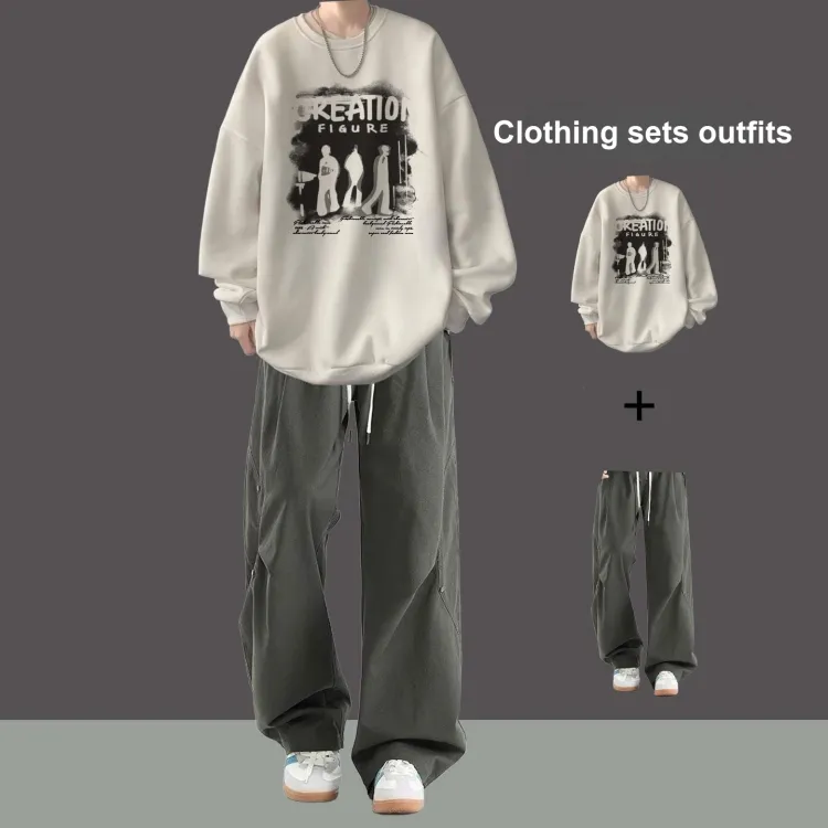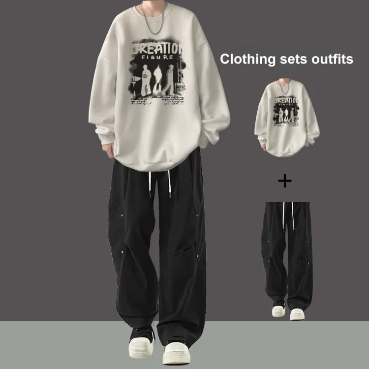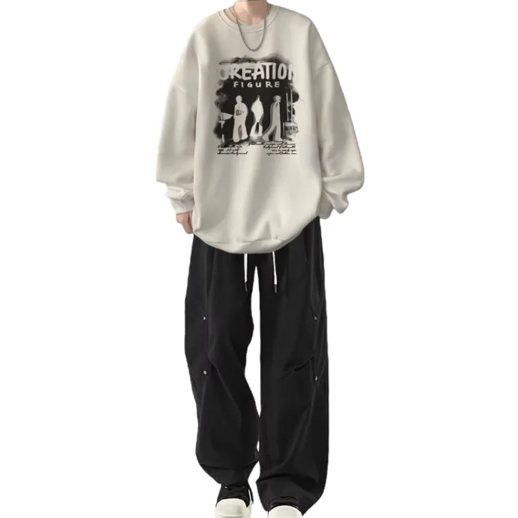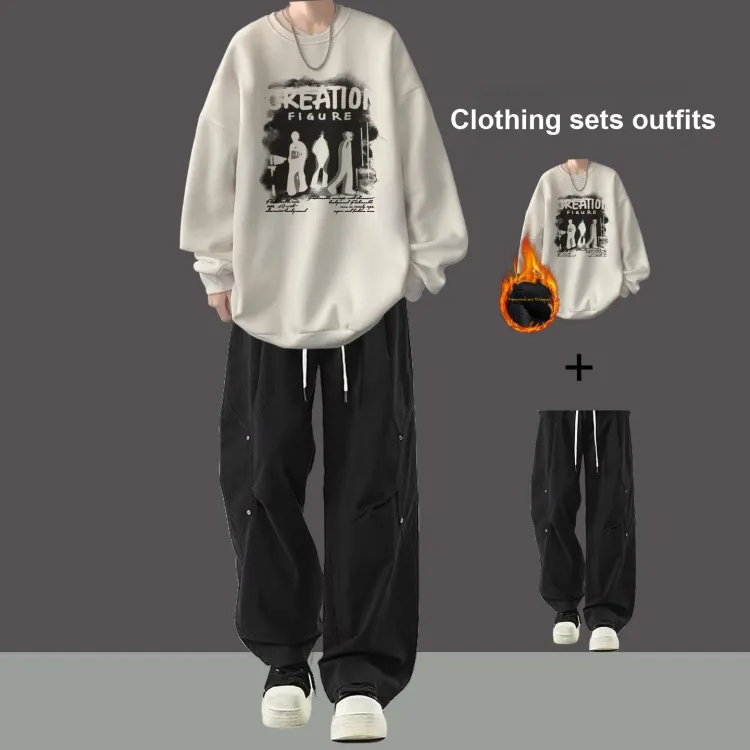 Флисовая подкладка, три тени, белый свитшот + черные повседневные штаны с двумя пуговицами