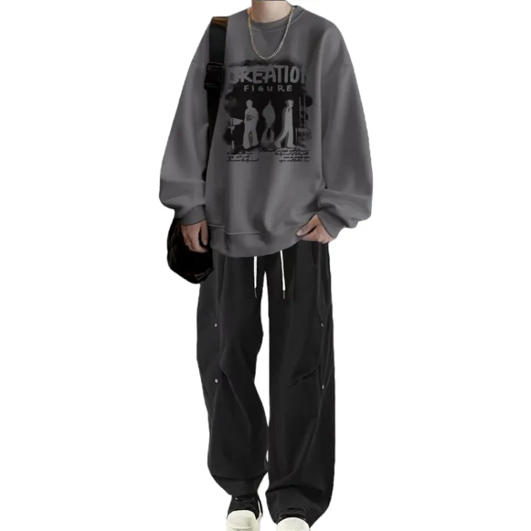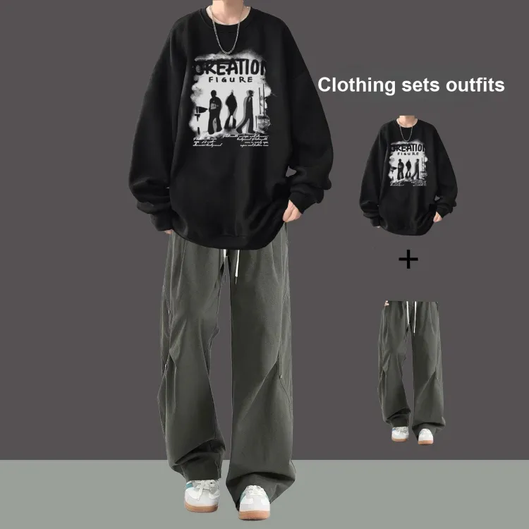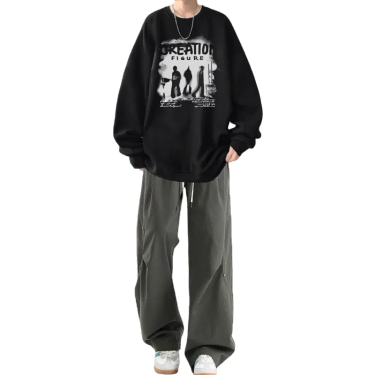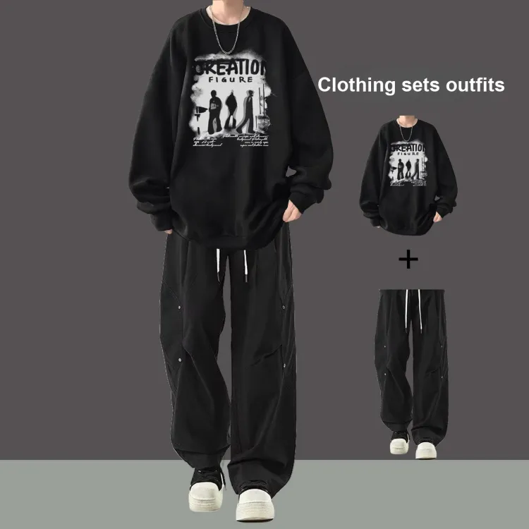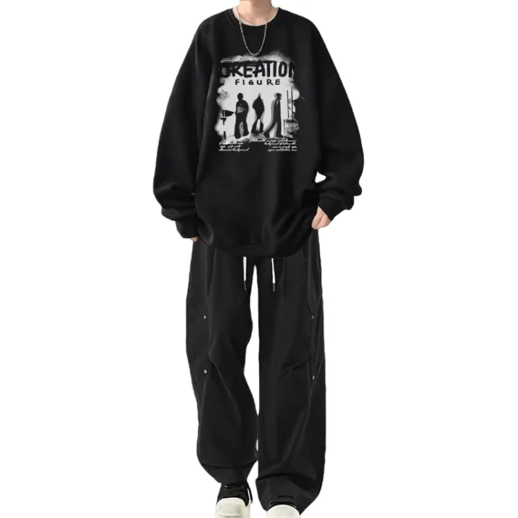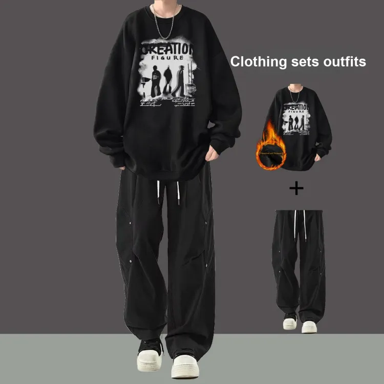 Флисовая подкладка, теневой черный свитшот + черные повседневные штаны с двумя пуговицами