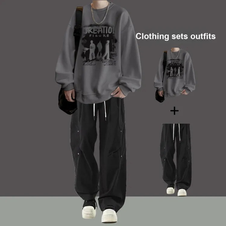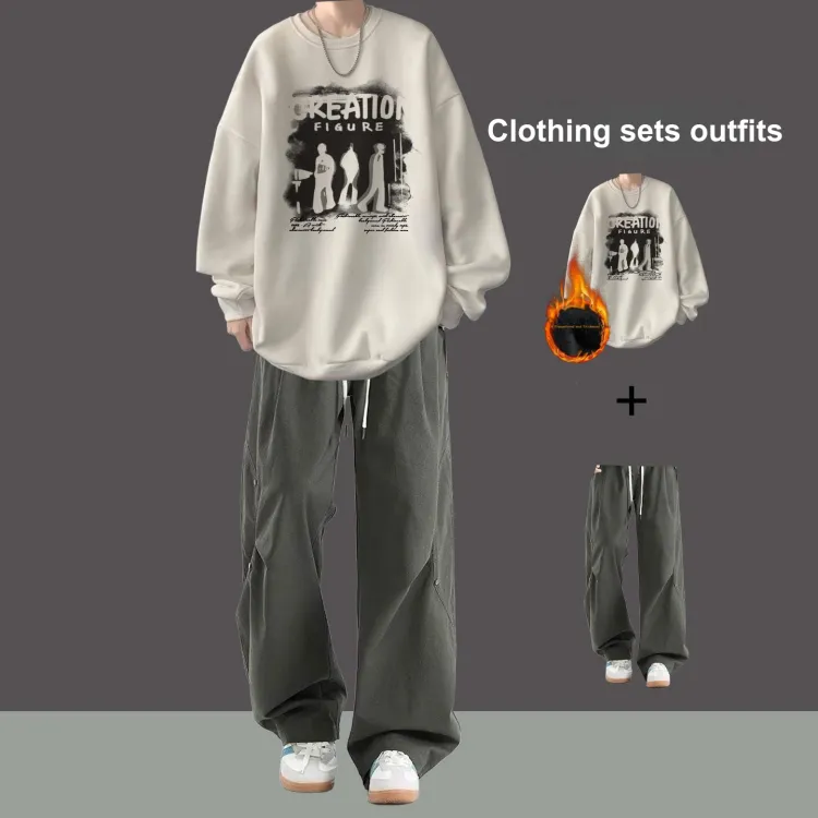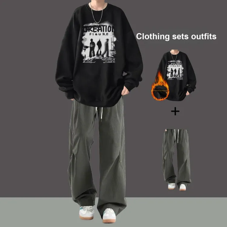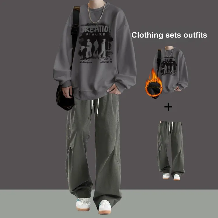 Флисовая подкладка, три тени, темно-серый свитшот + зеленые повседневные штаны с двумя пуговицами