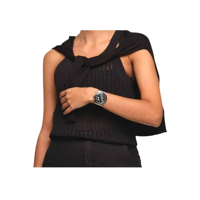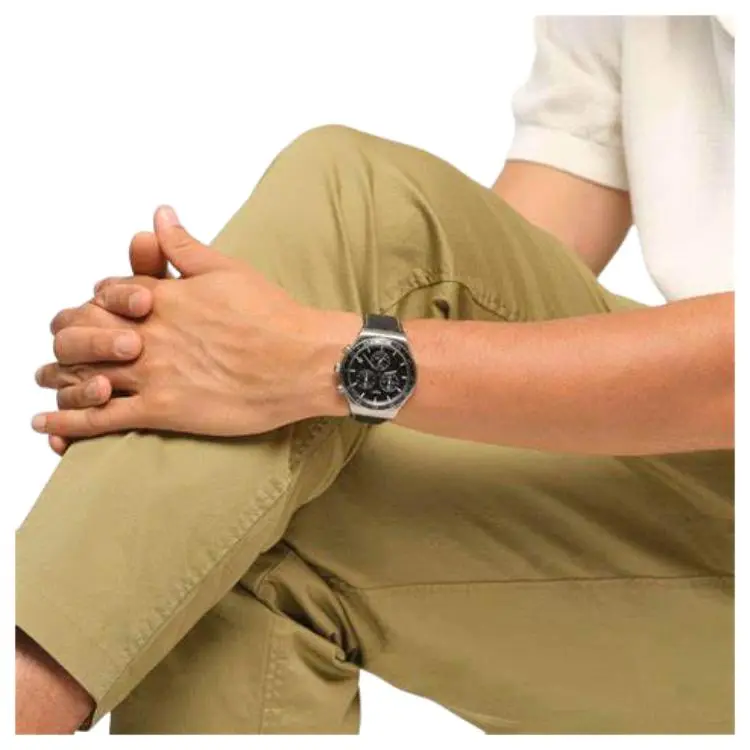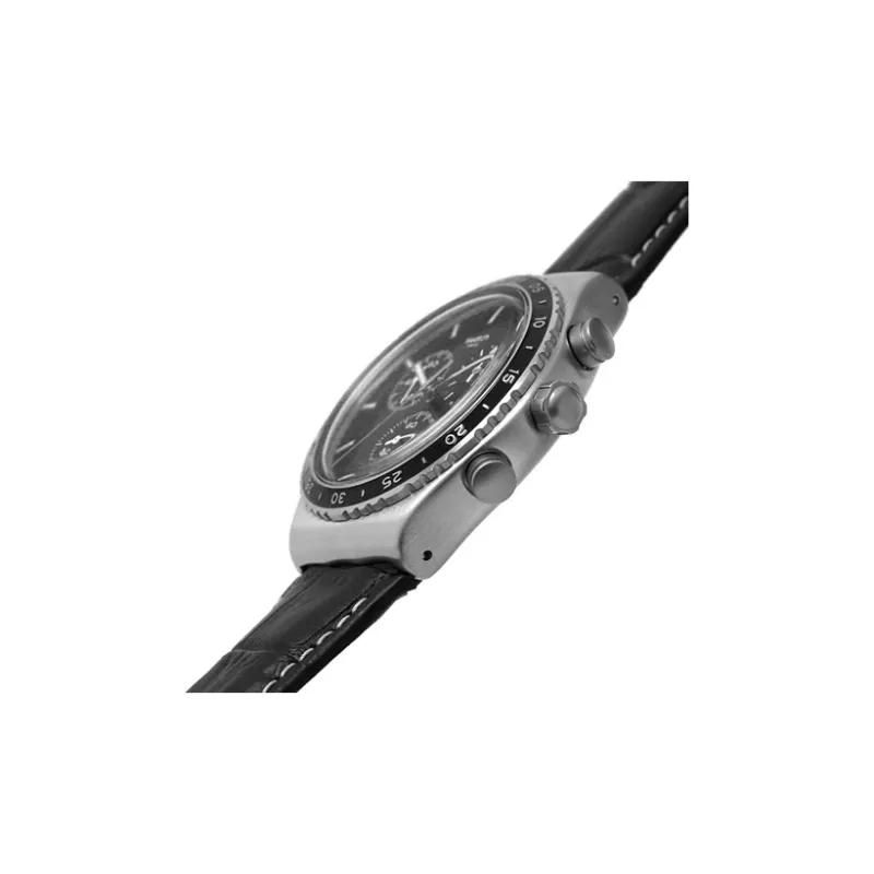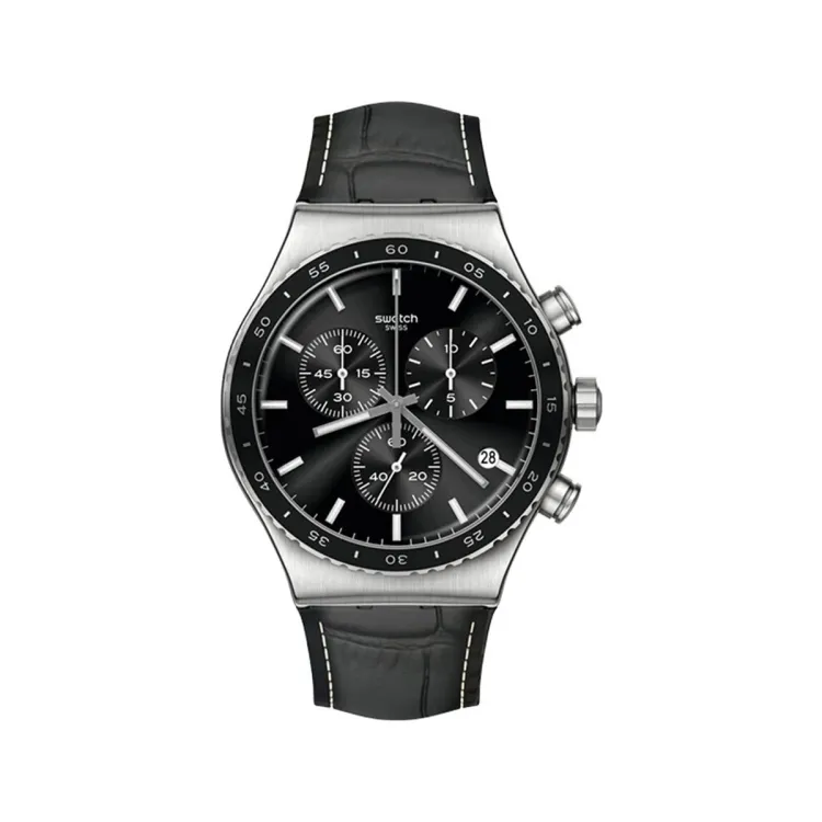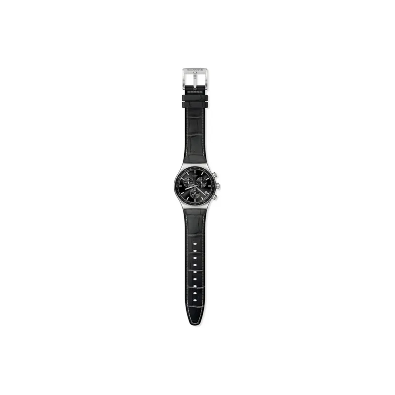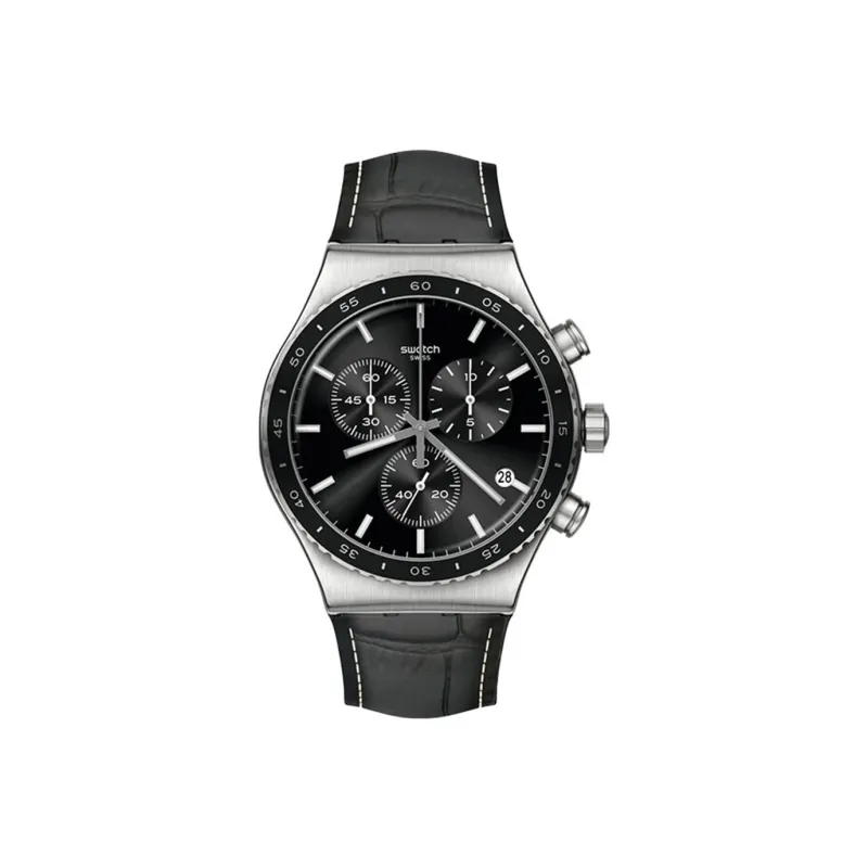 SWATCH NEW IRONY CHRONO Collection Кварцевый механизм Унисекс Часы 43 мм Черный циферблат Корпус из нержавеющей стали Кожаный ремешок