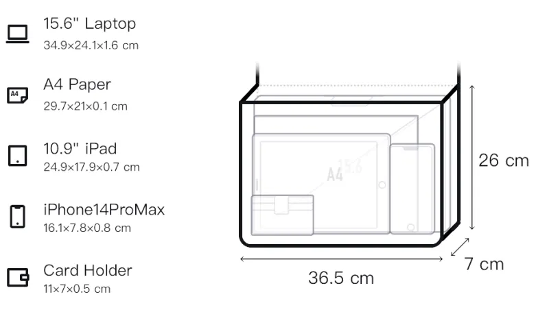 13-14 дюймов: Длина (размер в длину): 36,5 см, Ширина: 7 см, Длина корпуса: 26,5 см 15-15,6-16 дюймов: Длина (размер в длину): 40 см, Ширина: 7 см, Длина корпуса: 30 см 17-18 дюймов: Длина (размер в длину): 43,5 см, Ширина: 7 см, Длина корпуса: 31 см
