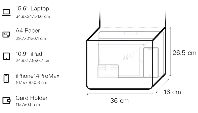 Длина 36 см * Ширина 16 см * Высота 26,5 см