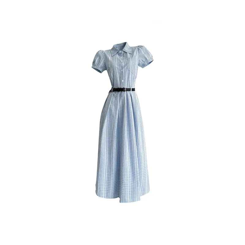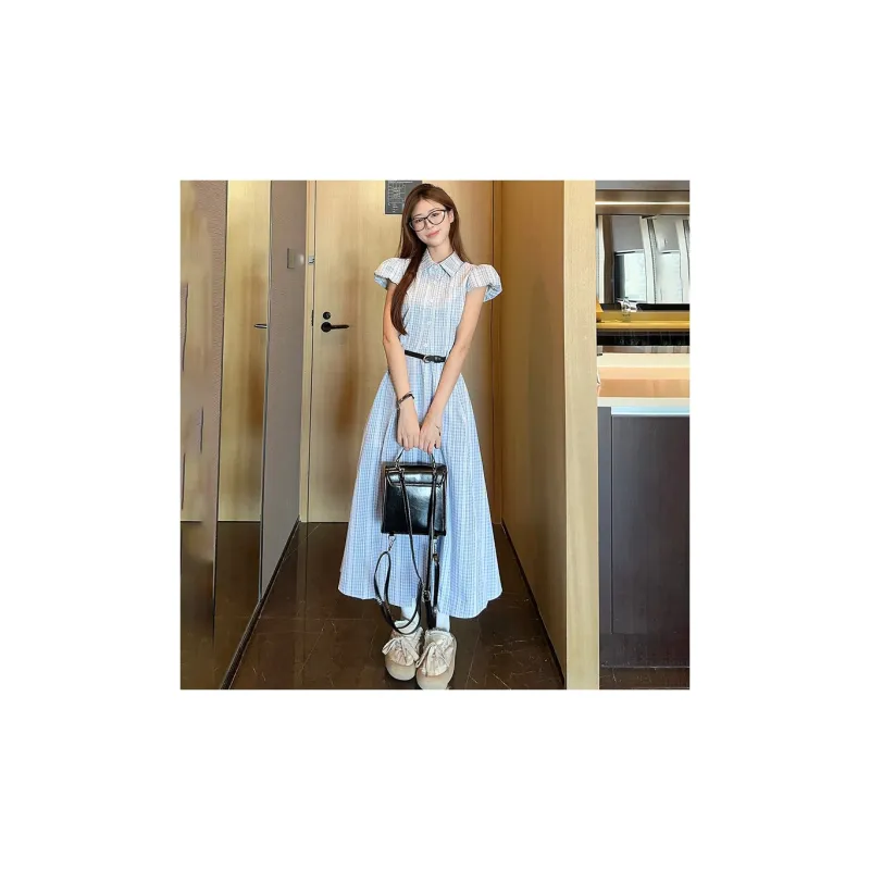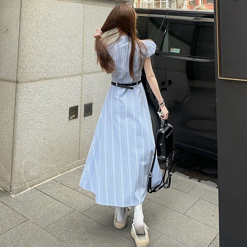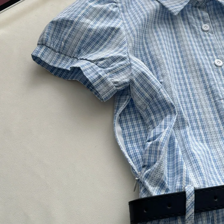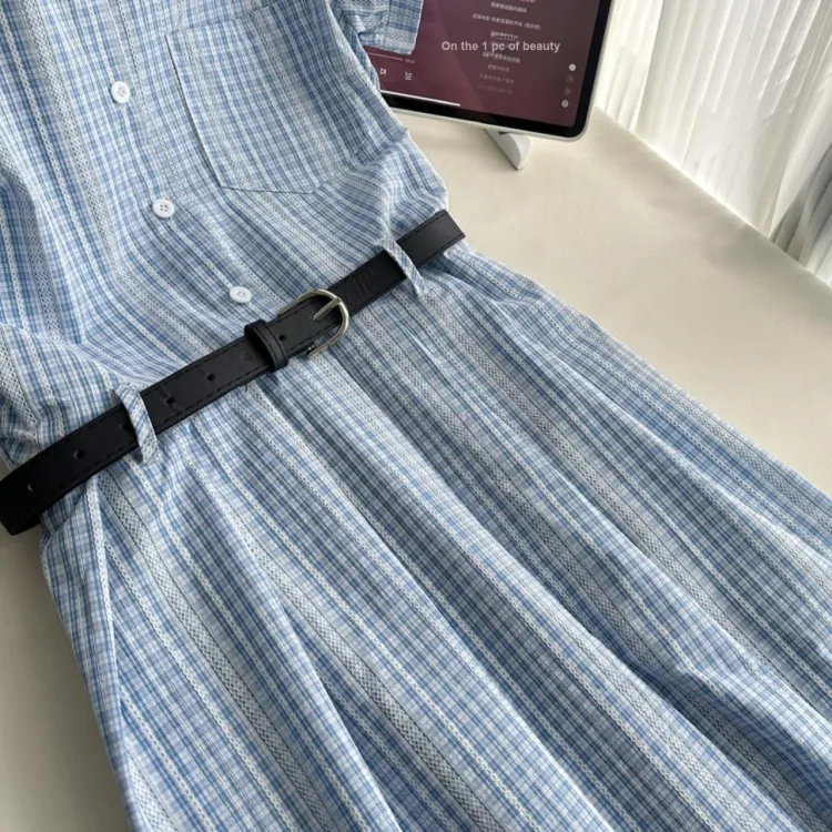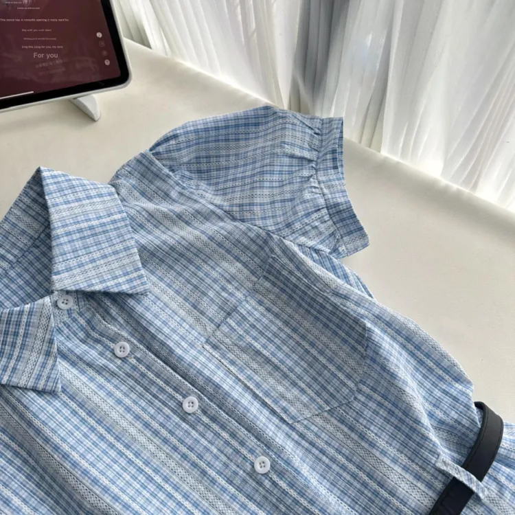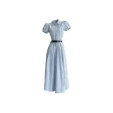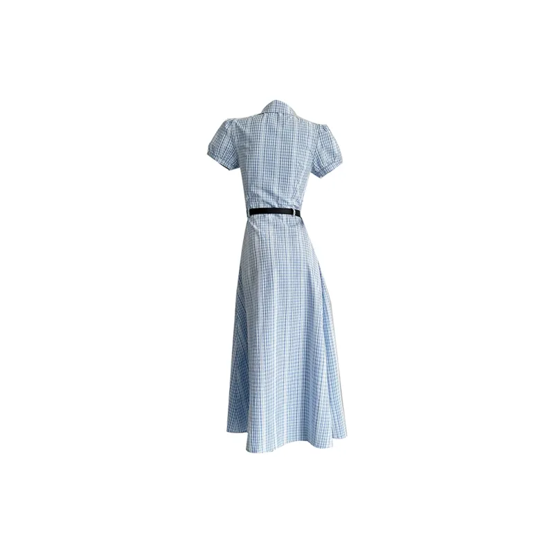 TIBINB Короткий рукав Платье Женское Светло-синие Клетка