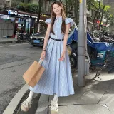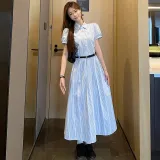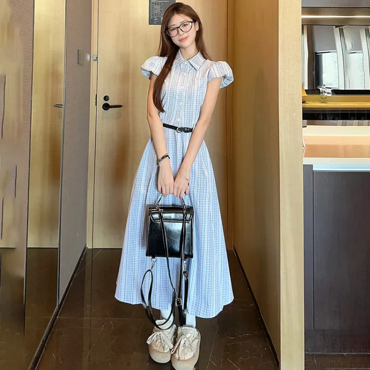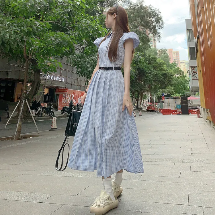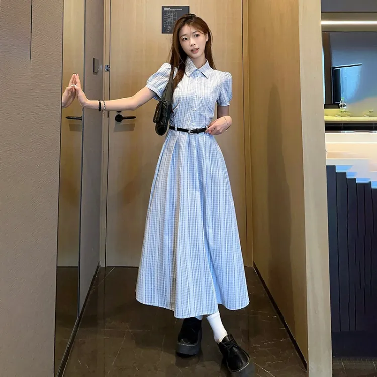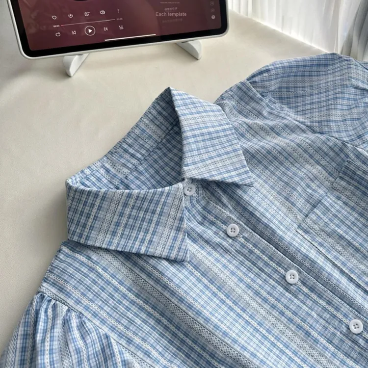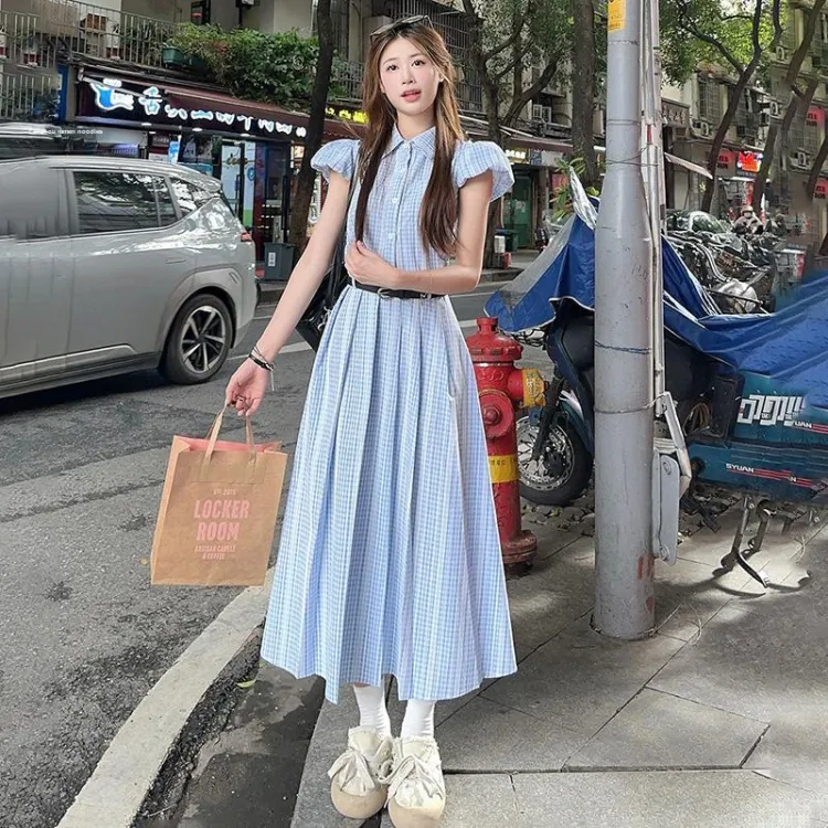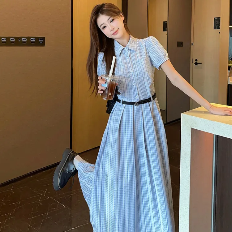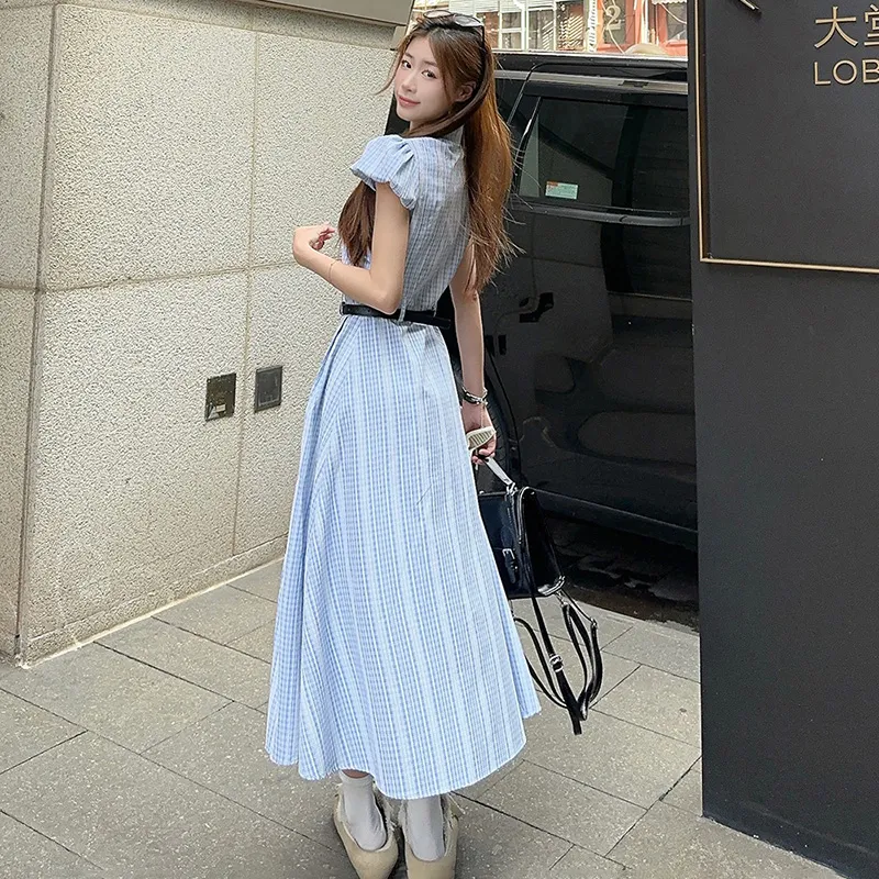TIBINB Короткий рукав Платье Женское Светло-синие Клетка