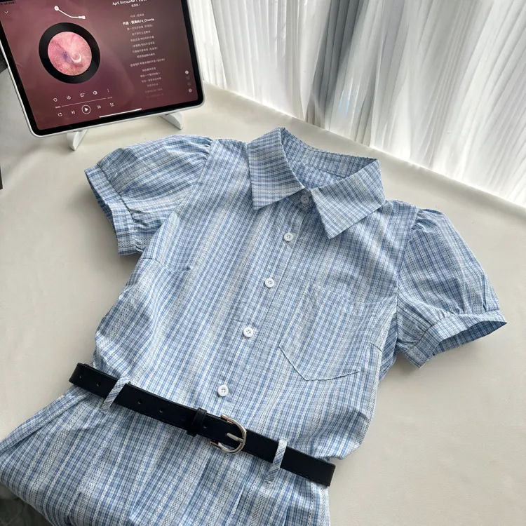Цвет:Светло-синяя юбка в клетку с ремешком