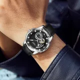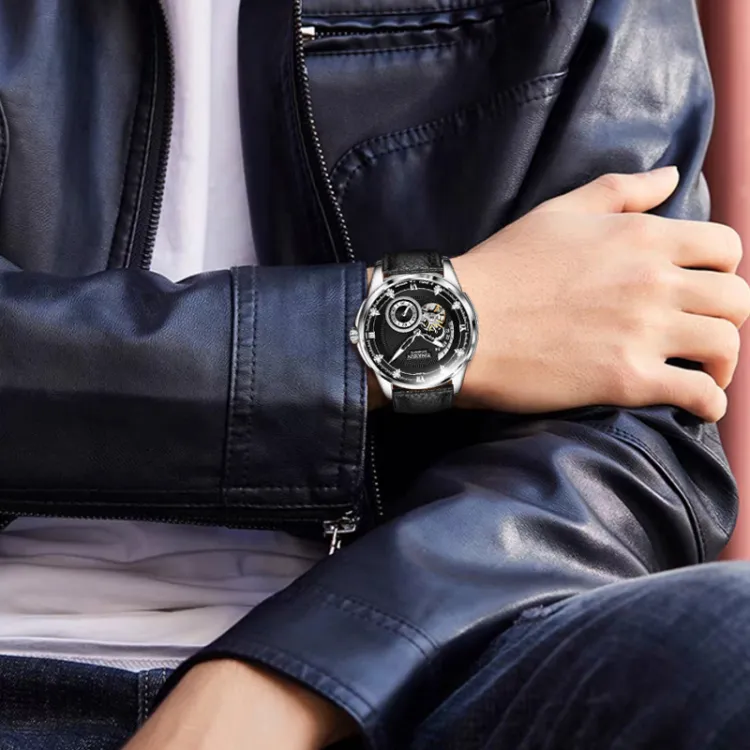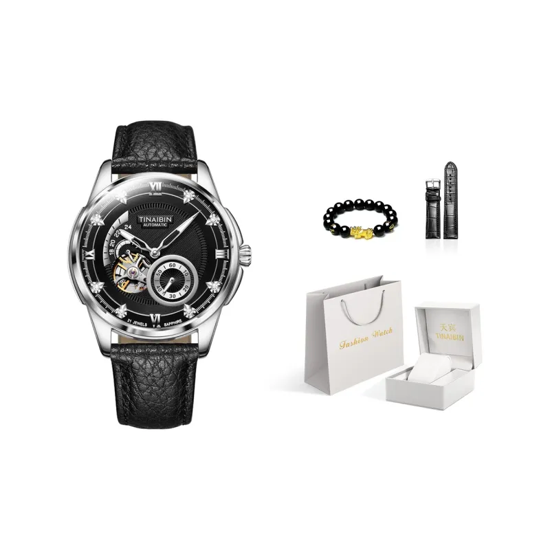 TINAIBIN Автоматический механический механизм часы с ремешком из коровьей кожи унисекс черный циферблат
