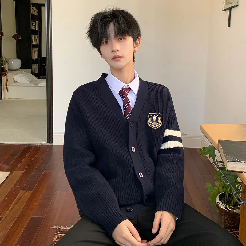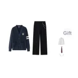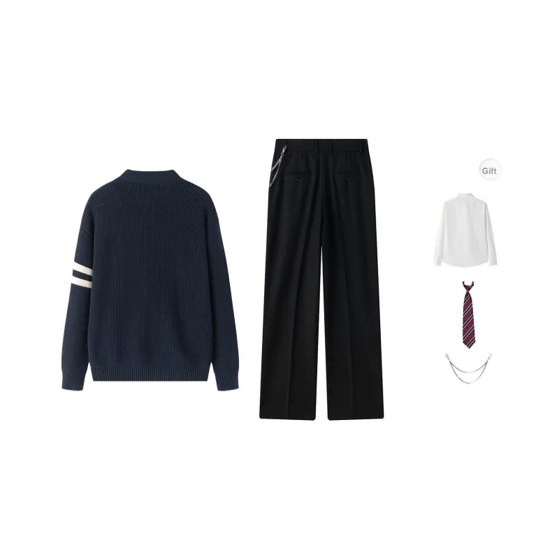 Темно-синий синий свитер + костюмные брюки, в комплекте бесплатно: рубашка (облегающая) + галстук, завязанный вручную + цепочки для брюк