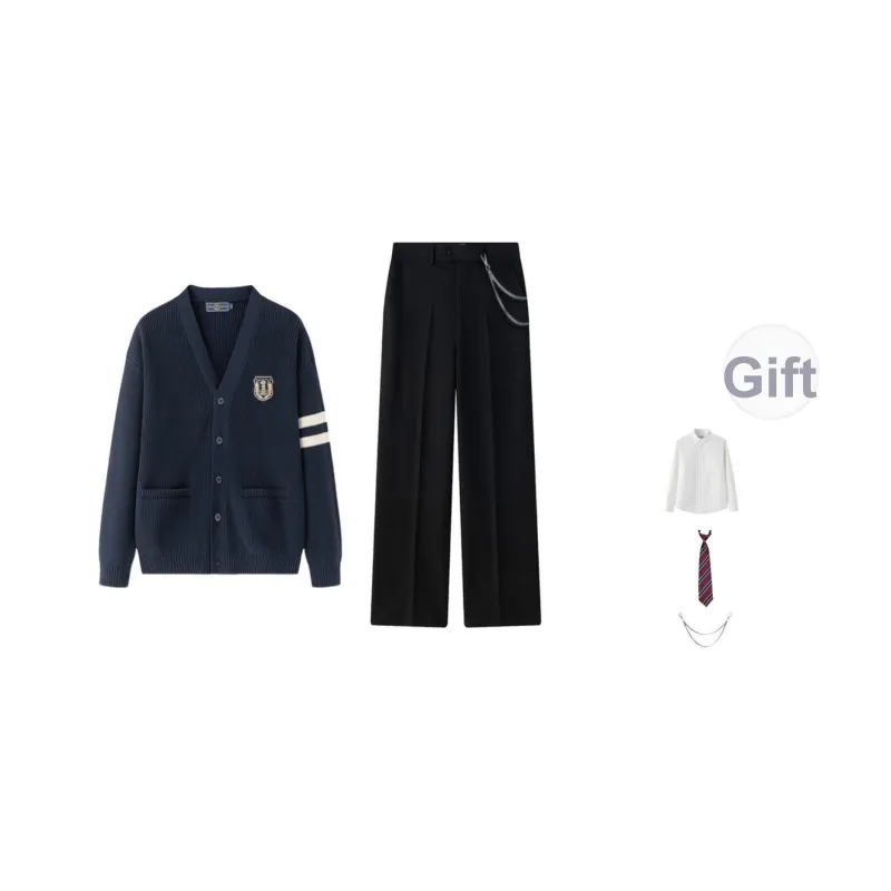 Цвет:Темно-синий синий свитер + костюмные брюки, в комплекте бесплатно: рубашка (облегающая) + галстук, завязанный вручную + цепочки для брюк