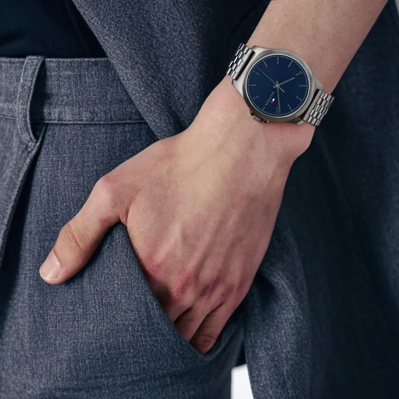 Tommy Hilfiger Мужские часы Кварцевый механизм Ремешок из нержавеющей стали 42 мм Синий циферблат