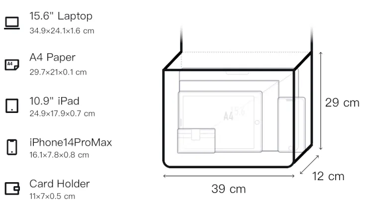 Верхняя длина (размер в длину): 48 см, нижняя длина: 39 см, ширина корпуса: 12 см, длина корпуса: 29 см