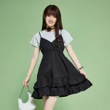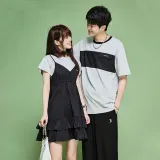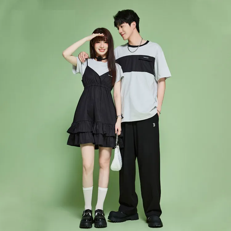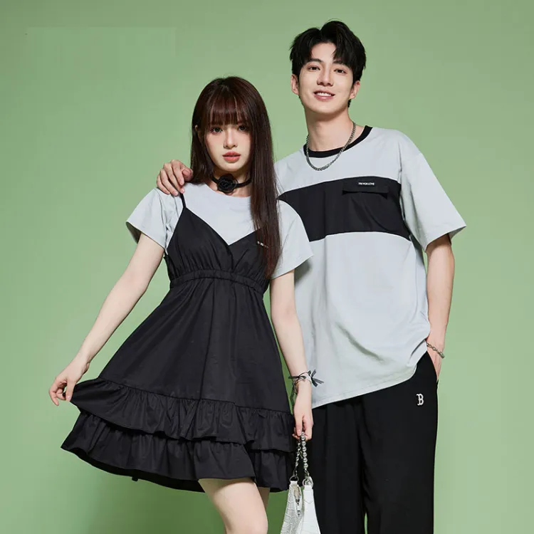 Цвет:Женская черная короткая футболка + платье с бретелями и мужская серая короткая футболка