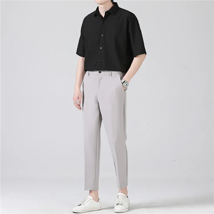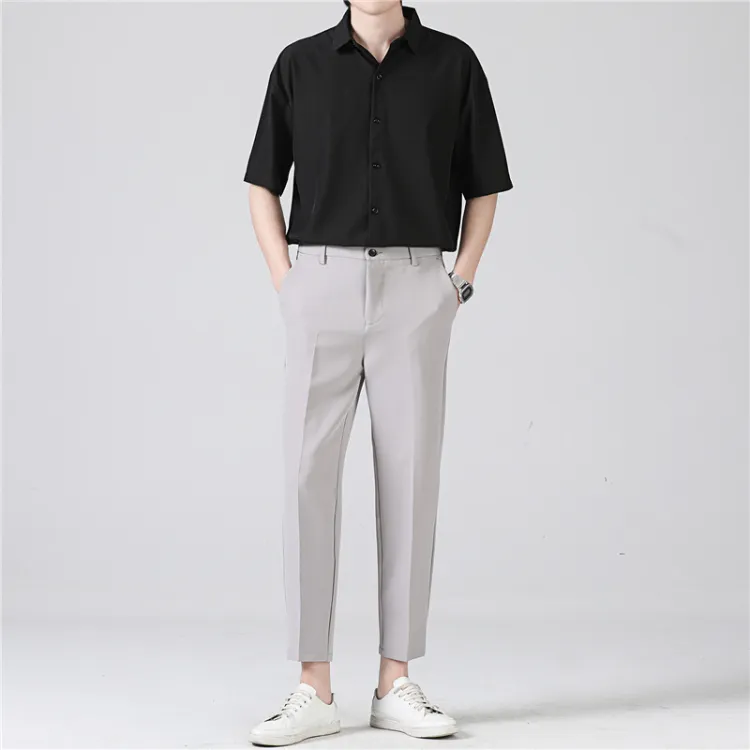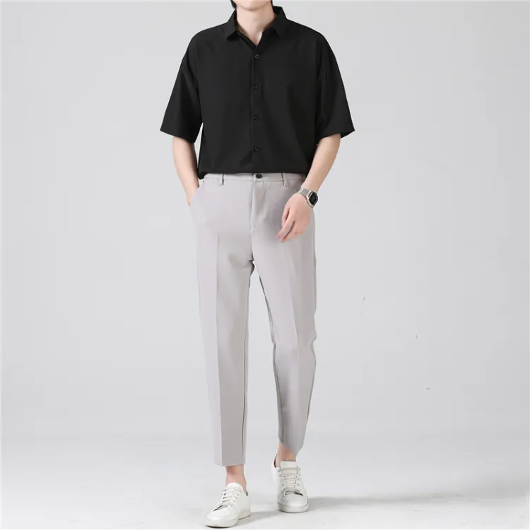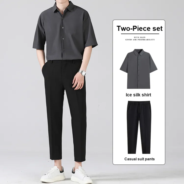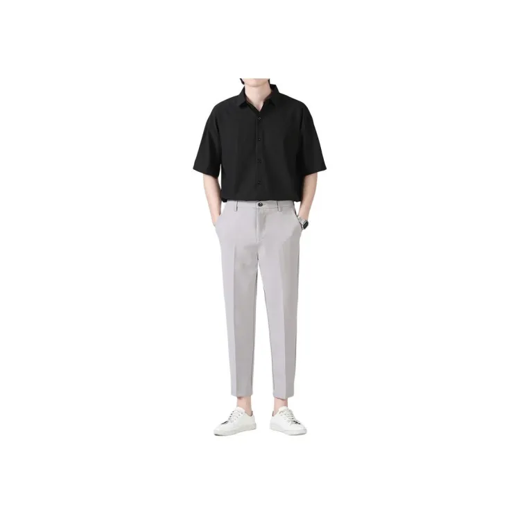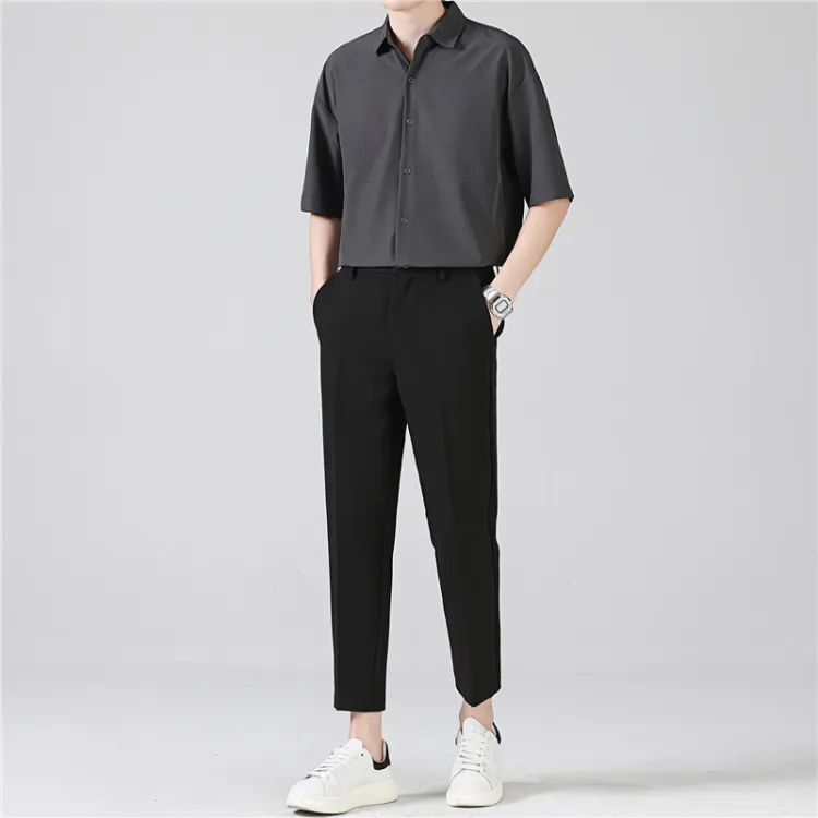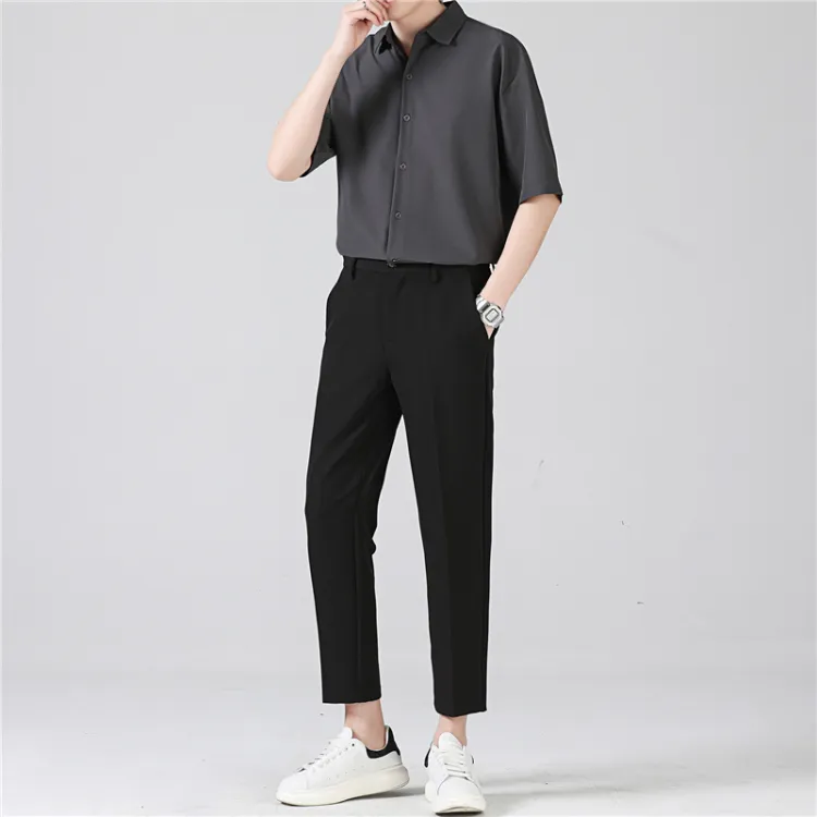 Темно-серая рубашка с коротким рукавом + черные штаны до щиколотки