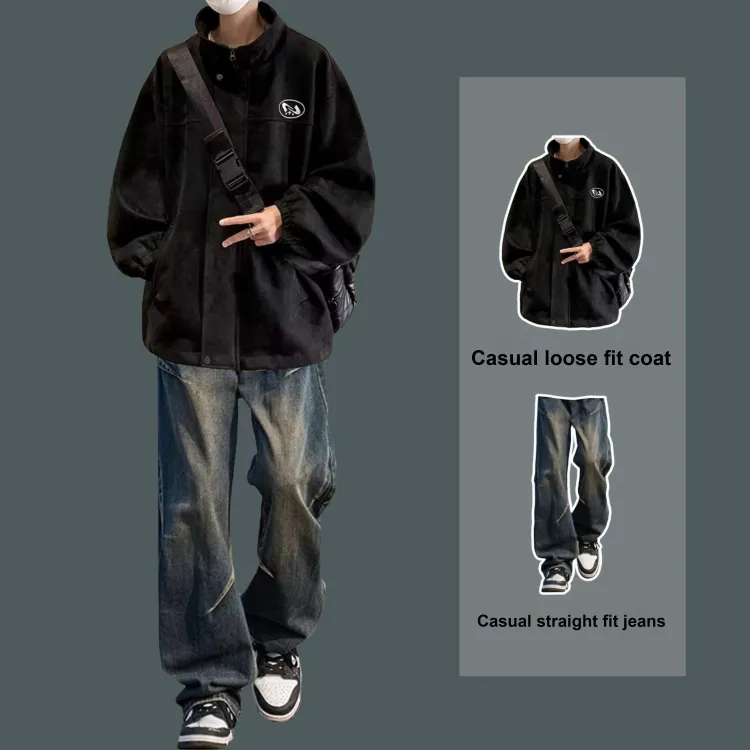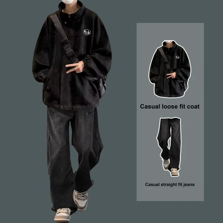 Двухкомпонентный комплект (Черная куртка + Винтажные синие джинсы)