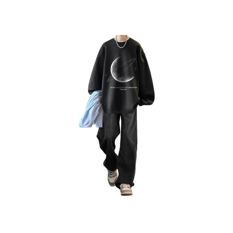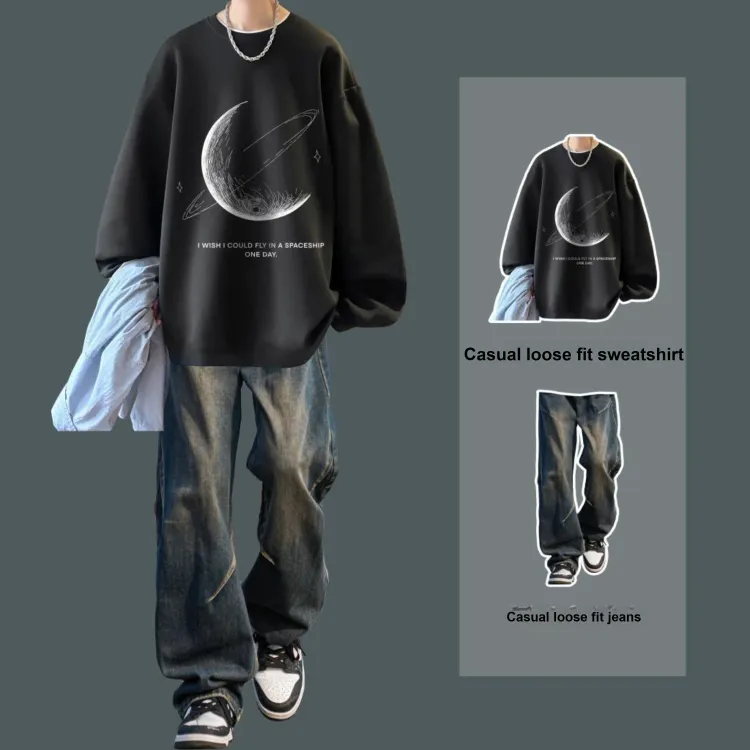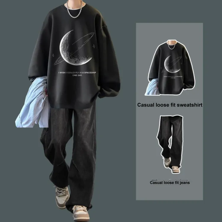 Двухкомпонентный комплект (Светло-серый свитшот + Черные джинсовые штаны)