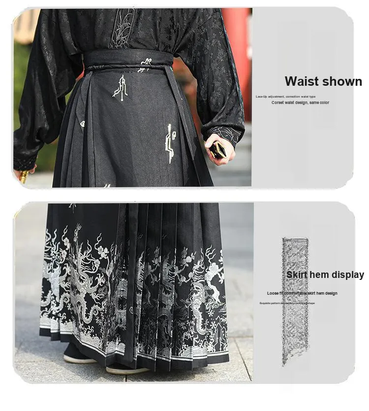 Черный топ + китайская юбка с узором "конское лицо" (Китайская юбка с узором "конское лицо" является типом традиционных китайских брюк, часто носимых с топом для официальных мероприятий)