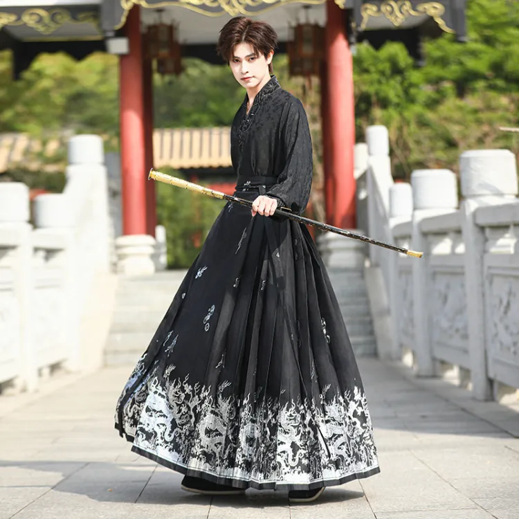 TUCANO Черный топ + Китайская юбка с узором "конское лицо" IS A Тип OF Традиционные Китайские Брюки Часто Носимые с Топом для Формальных Событий. Мужские Костюмы в стиле Тан