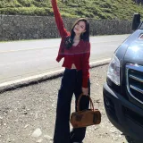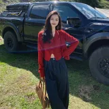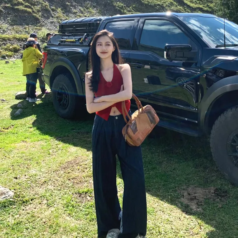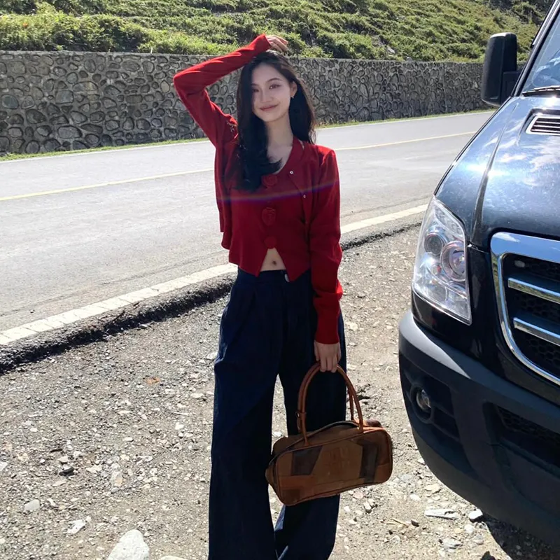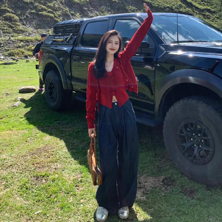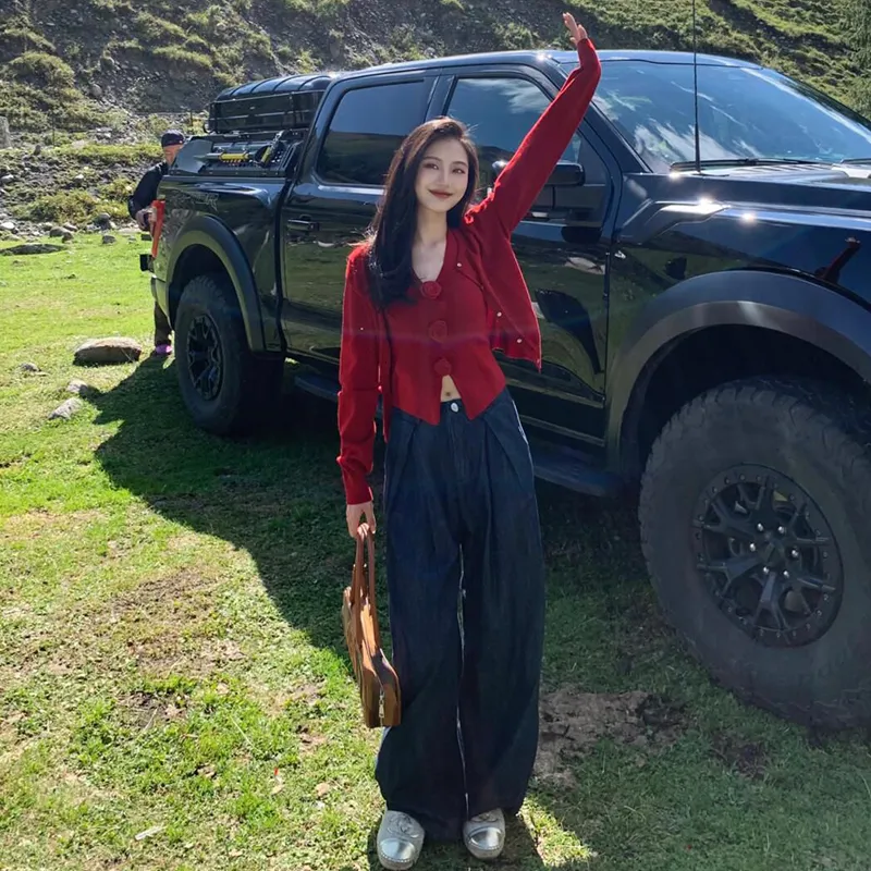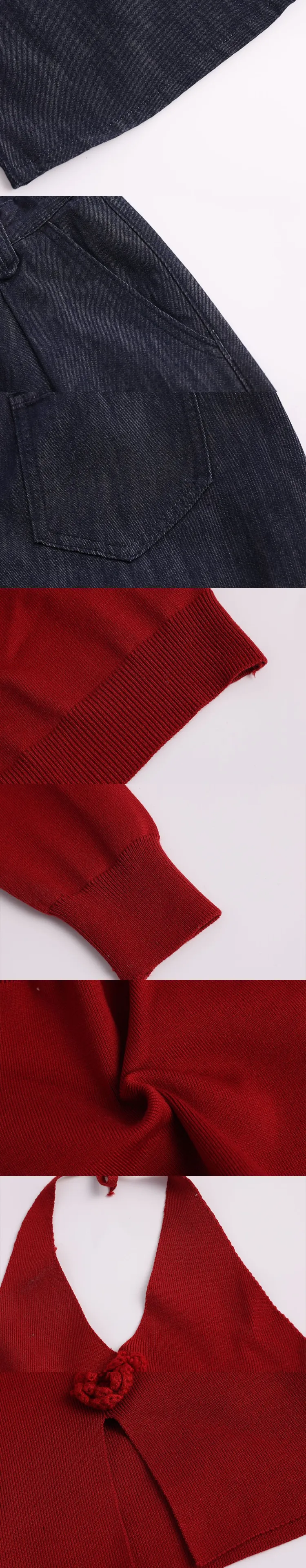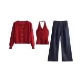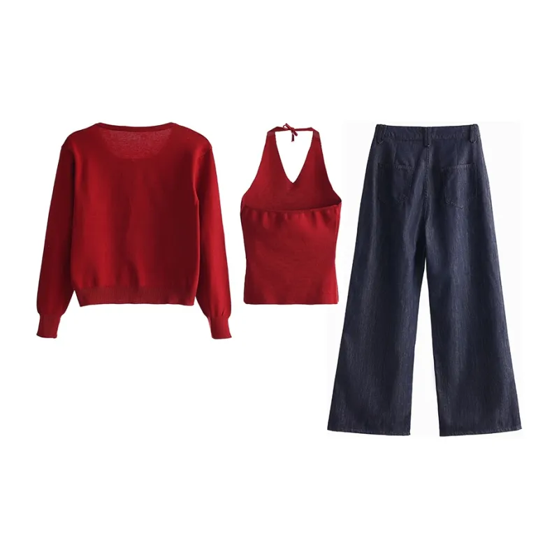 UTHA Повседневный Комплект Женский Красный Кардиган + Красная Майка + Темно-Синие Джинсы
