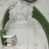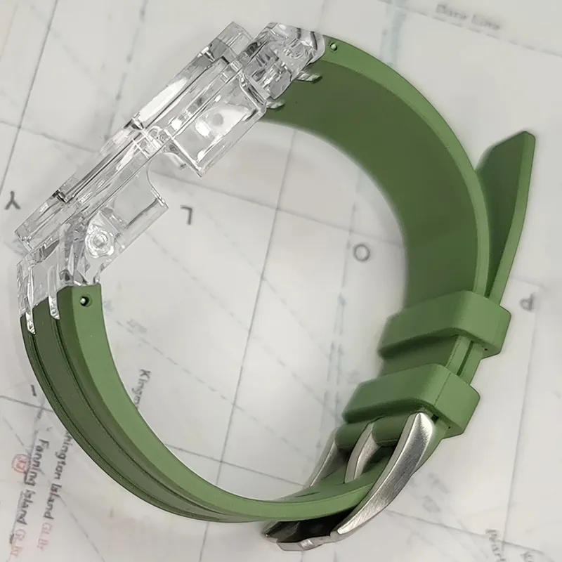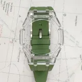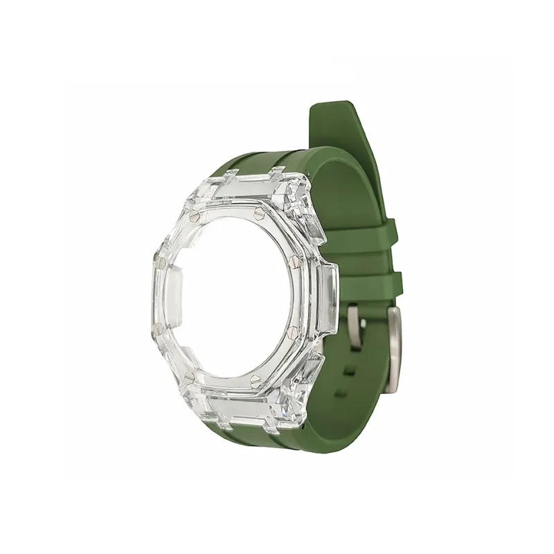 Прозрачный чехол, зеленый ремешок.