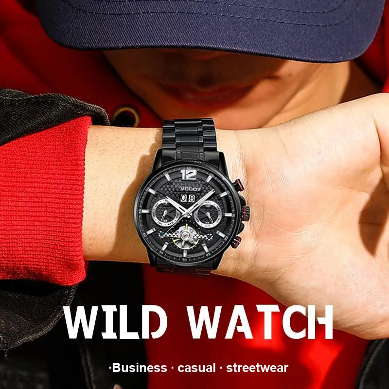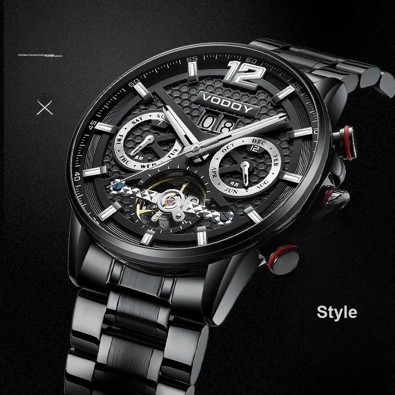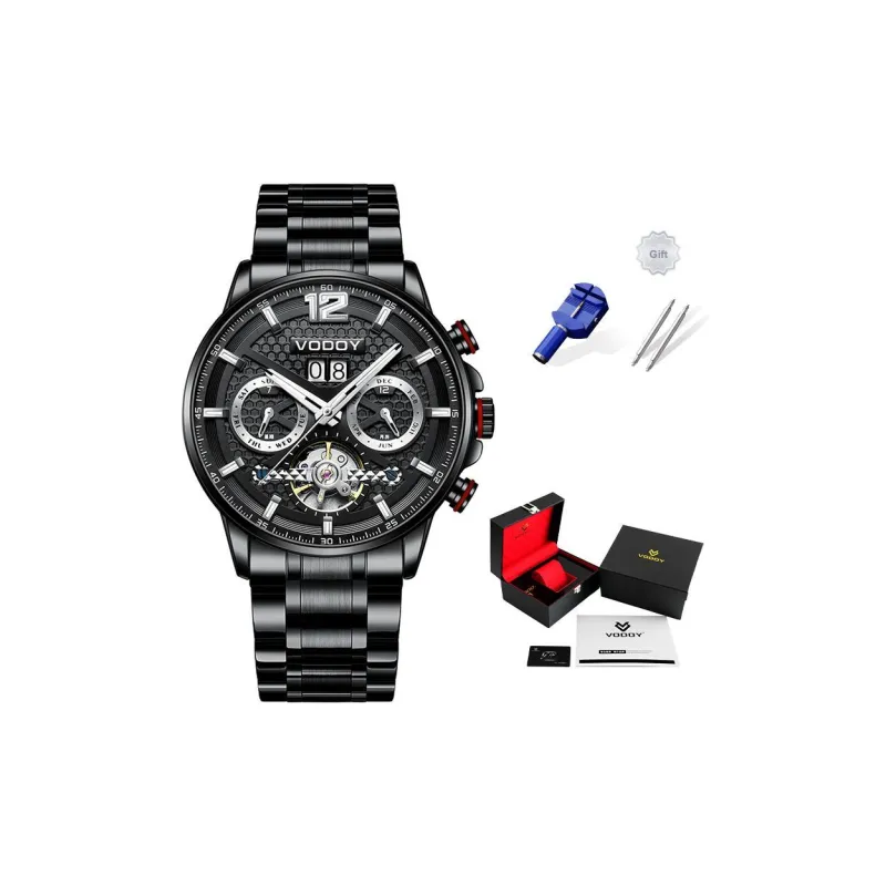 VODOY-5131 Черный корпус с черным циферблатом, серебряная заклепка, стальной браслет