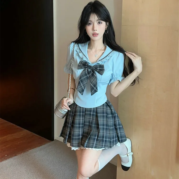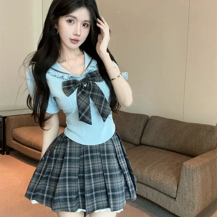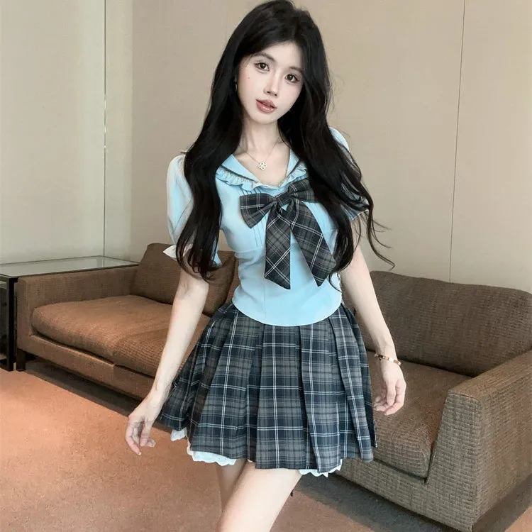 WICK BUEN Двухкомпонентный комплект [Топ с бантом + Клетчатая юбка с оборками] Женская униформа