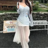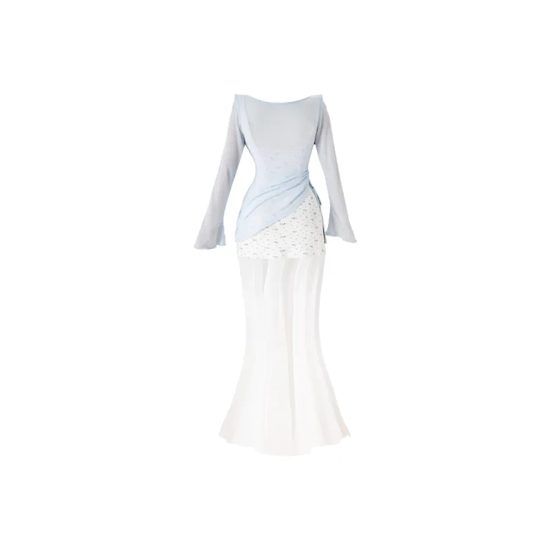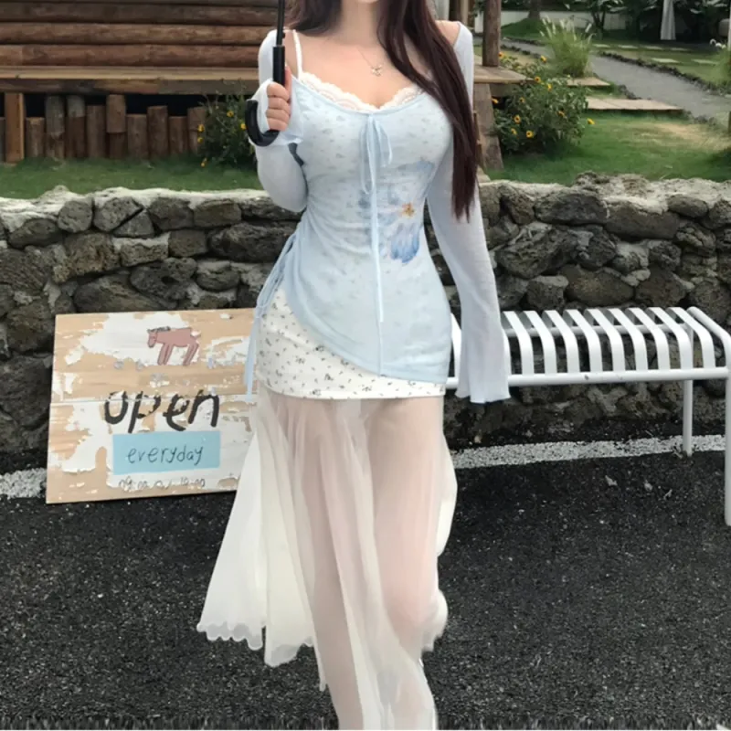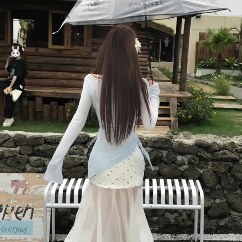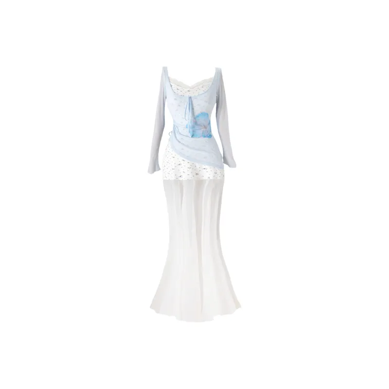 WLEQK Светло-синий COVER UP + Цветочное Платье Женские Комплекты с юбкой