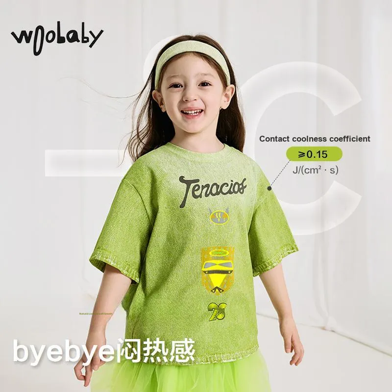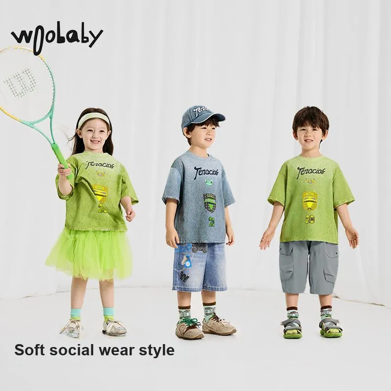 Woobaby 100% хлопок, охлаждающий T-рубашка, деним, с принтом, горохово-зеленый, для детей в возрасте 3-7 лет