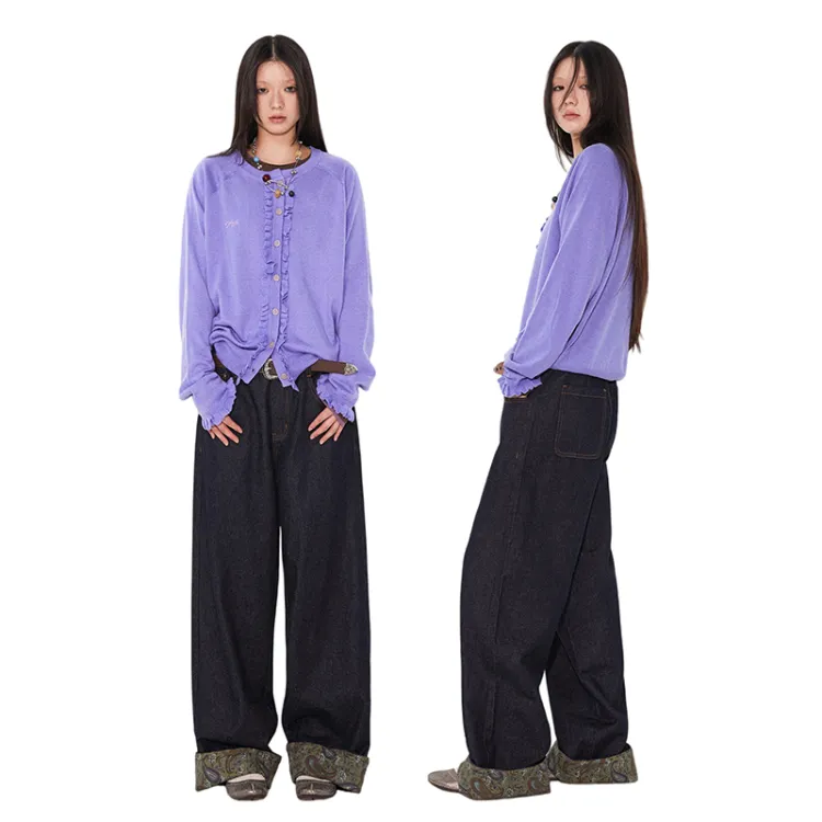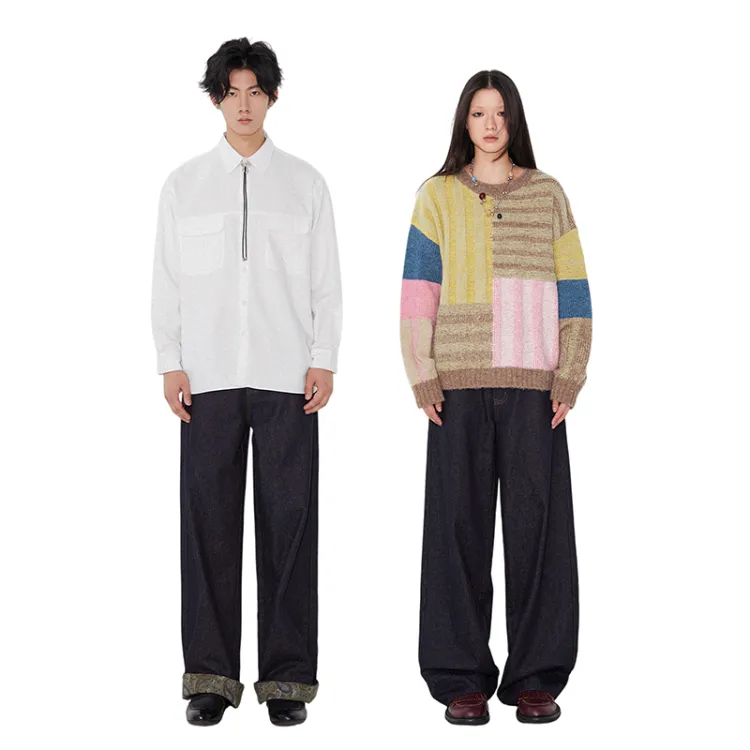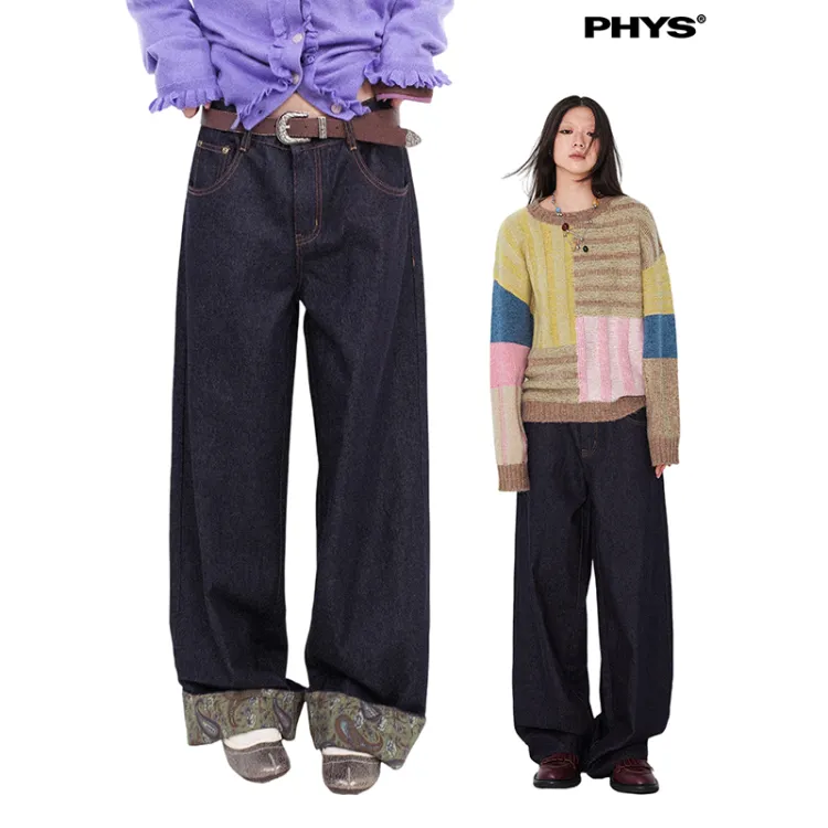WULISHAONIAN Пэчворк Джинсы с обрезанной манжетой прямой крой унисекс темно-синий