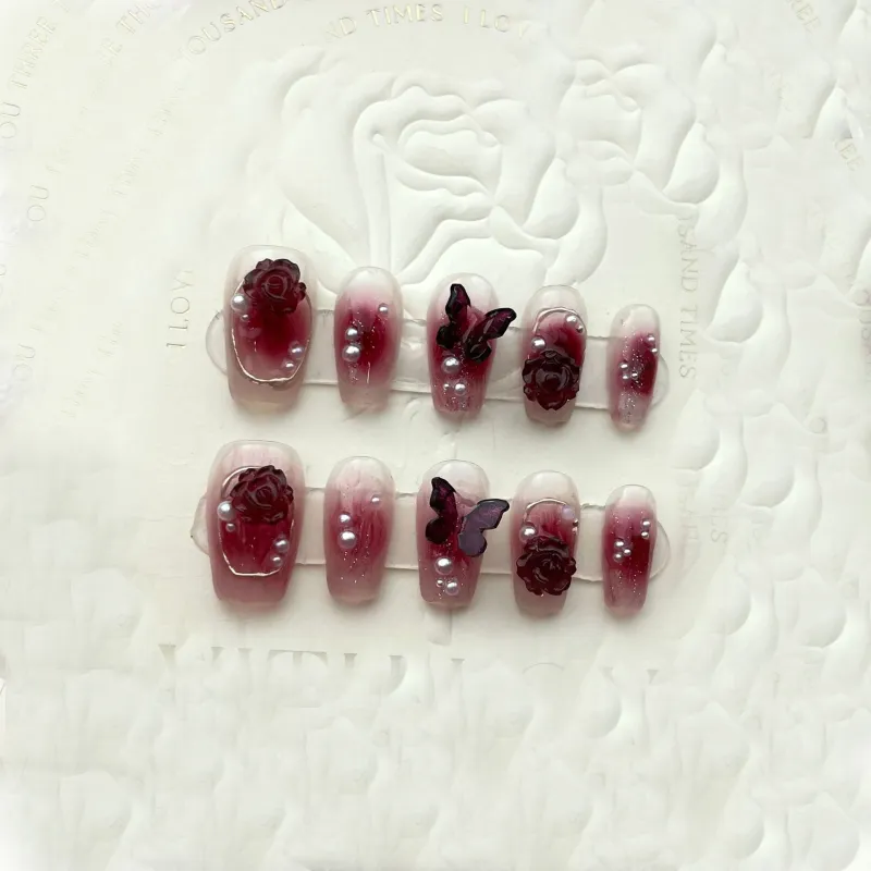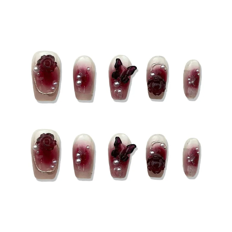 XIAMEIYU Камелия Бабочка Красный Ручной Работы Бургунди Градиент Жемчужный False Nail Короткий LADDER 20 мм