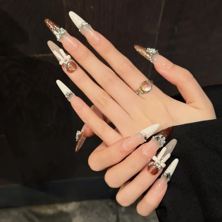XIAMEIYU CHANEL Inspired Бант False Nail Tapered Длинный Бежево-коричневый Градиентный Coquette 35mm