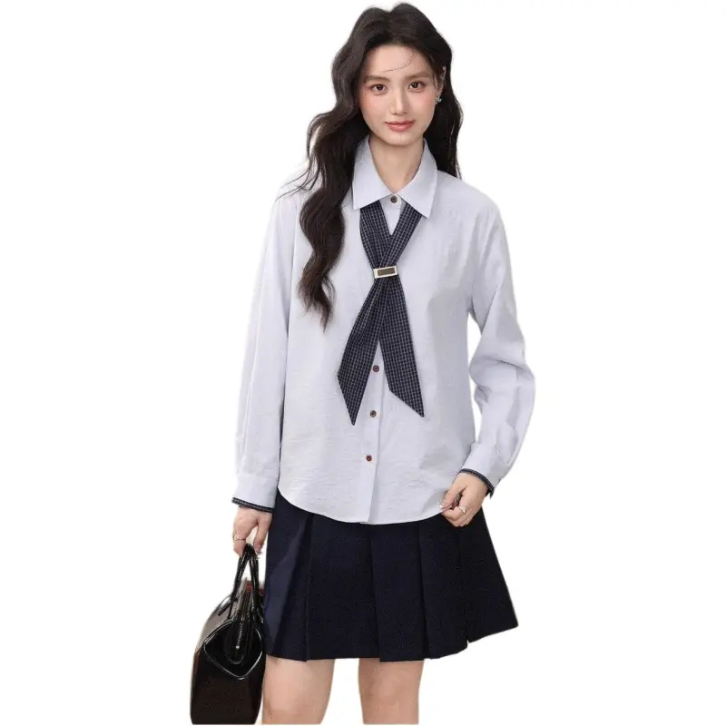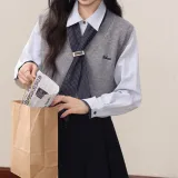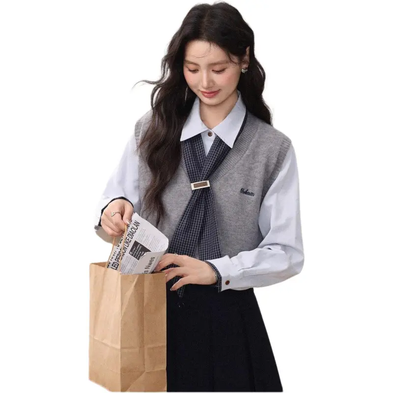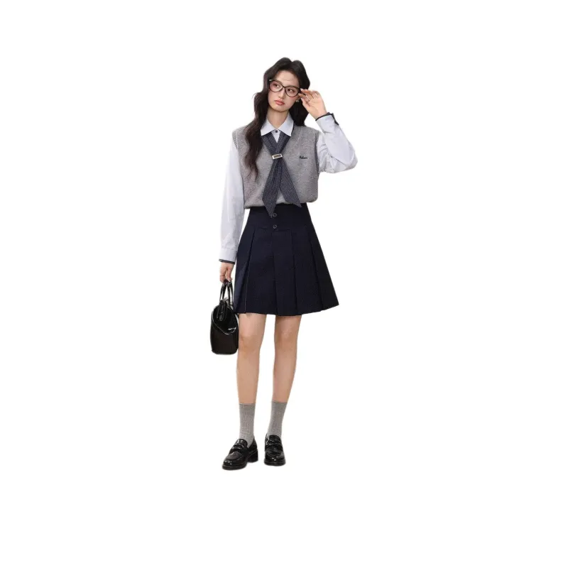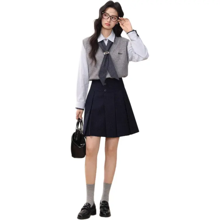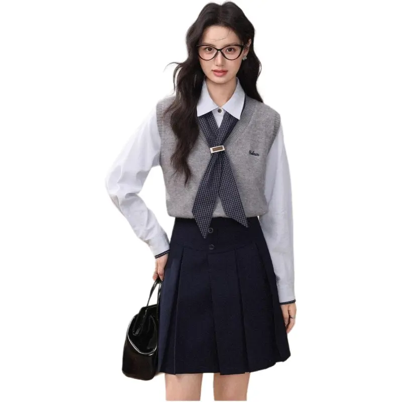 Комплект:Серый жилет + синяя рубашка + шелковый шарф + короткая юбка
