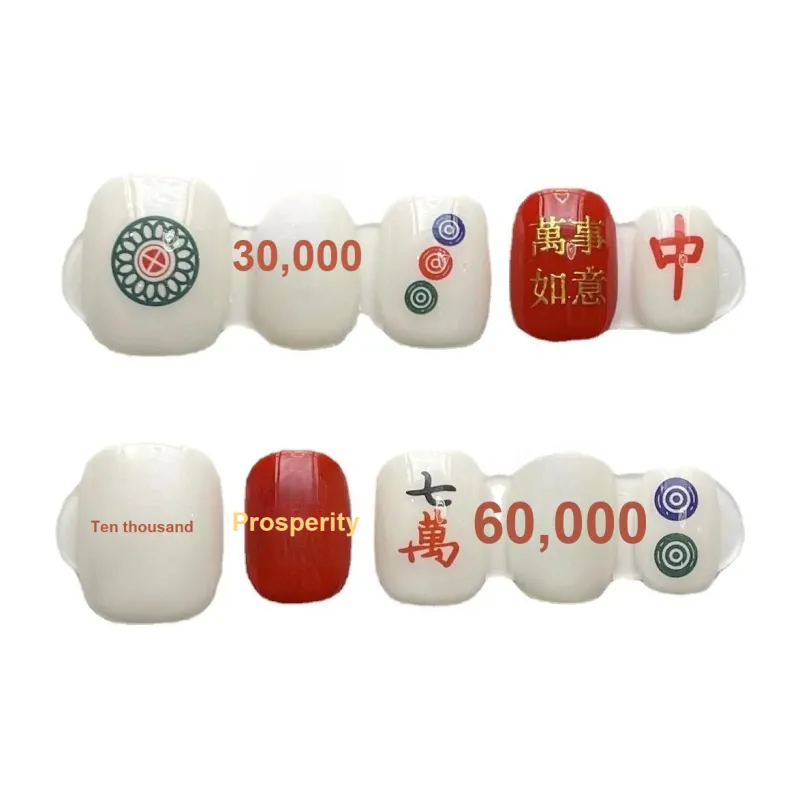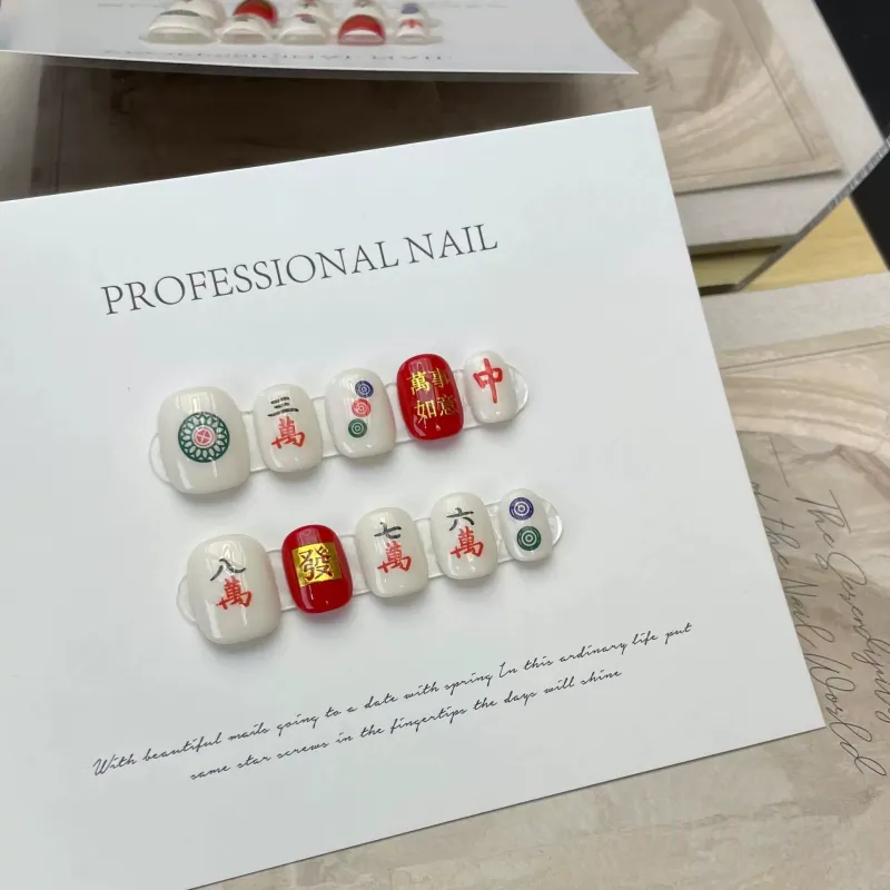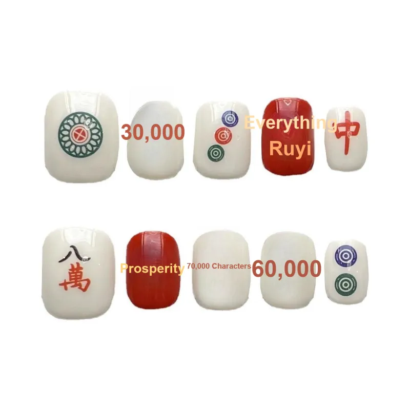 XIBI Процветание Богатство Прозрачный Маджонг с Красными Средними Полосатыми и Квадратными Узорами False Nail