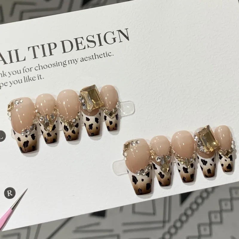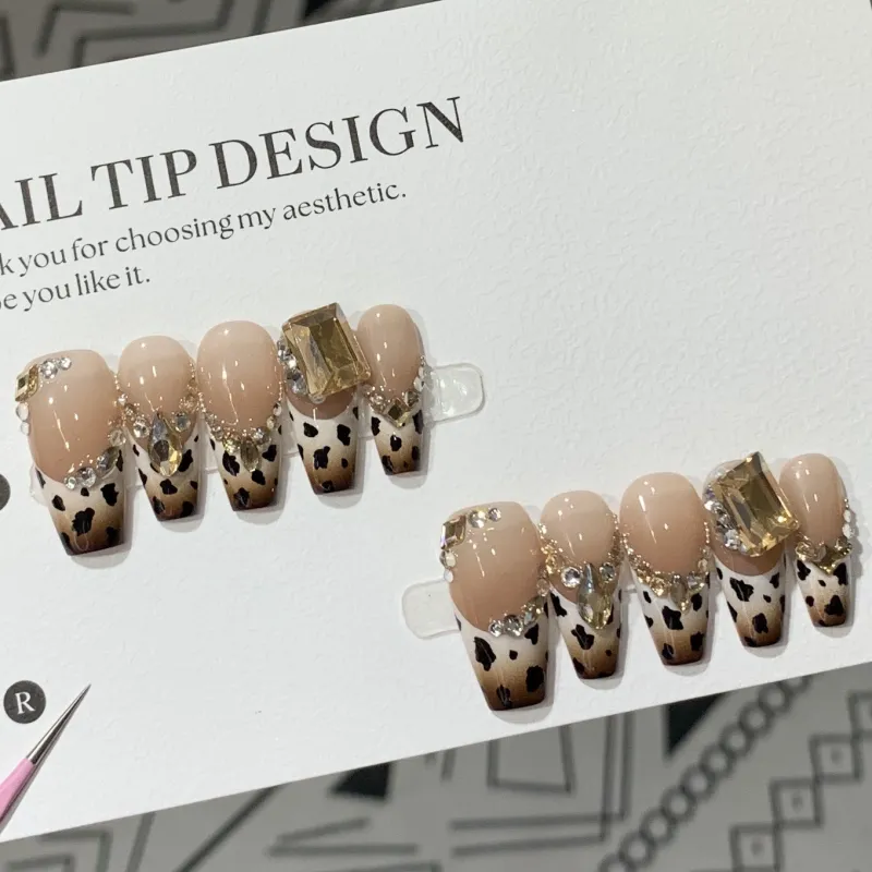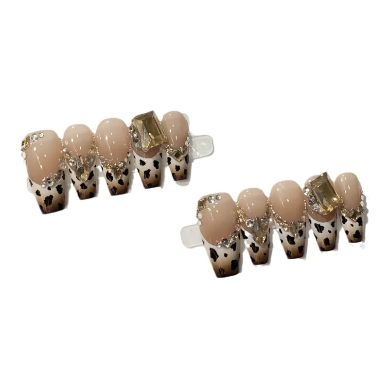 XIBI Icy Clear Gradient French Leopard Print Cat Eye Crystal False Nail Short LADDER 15mm