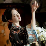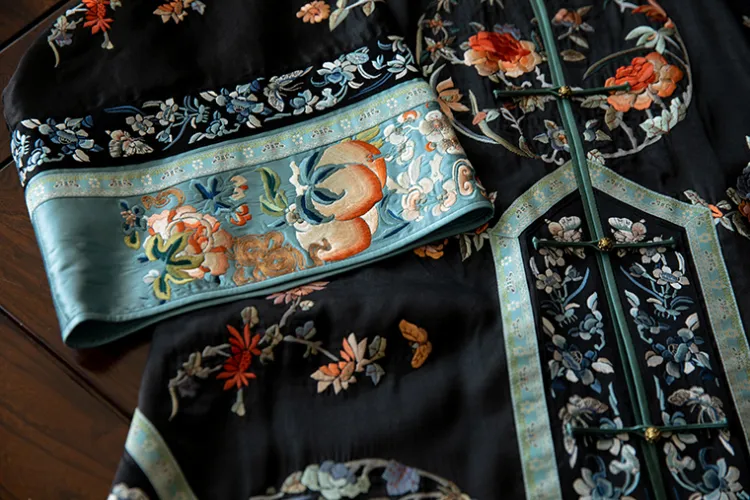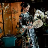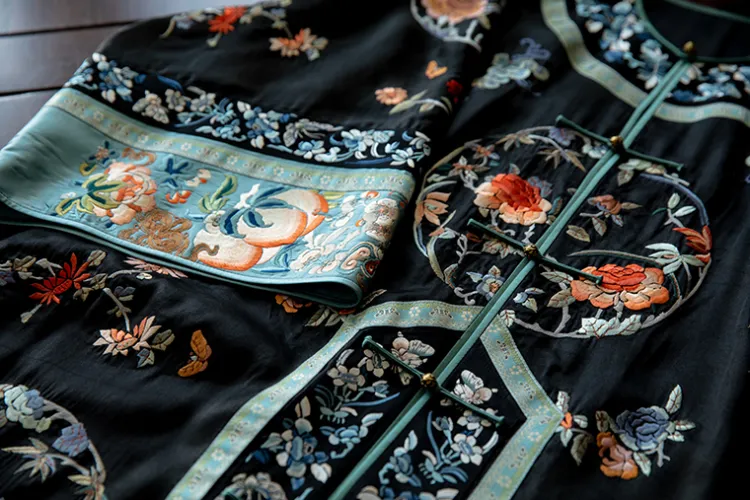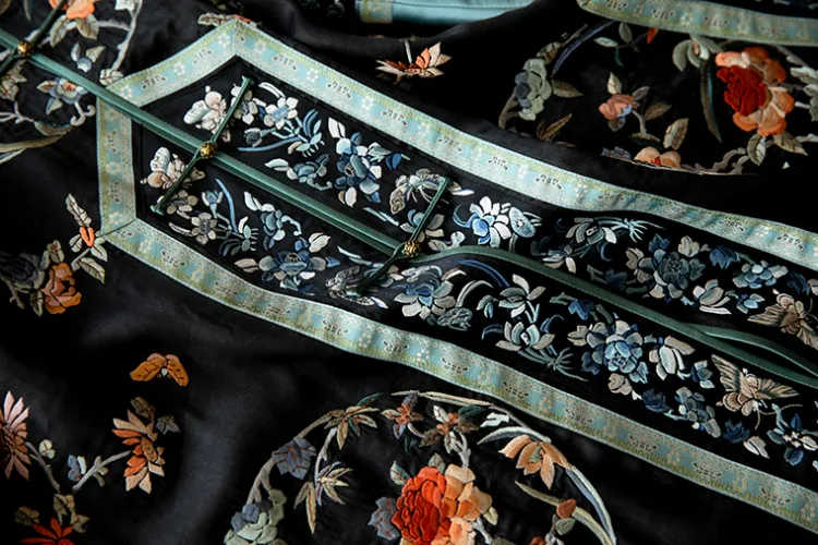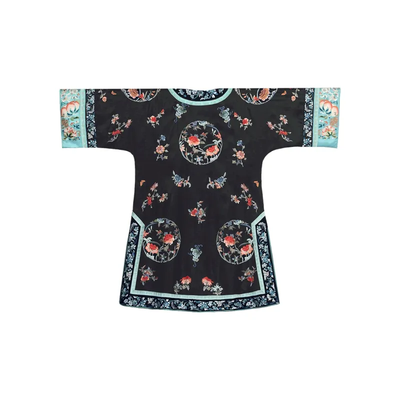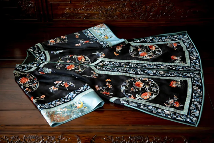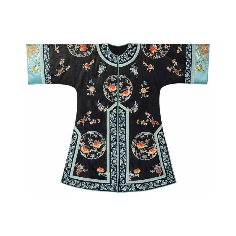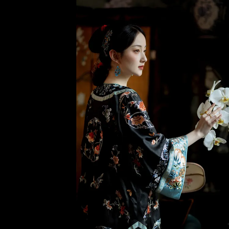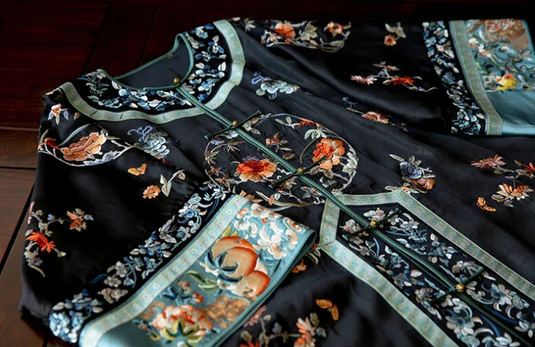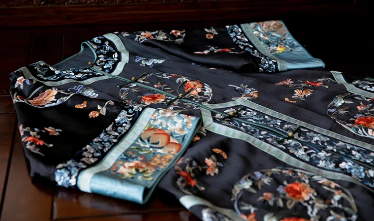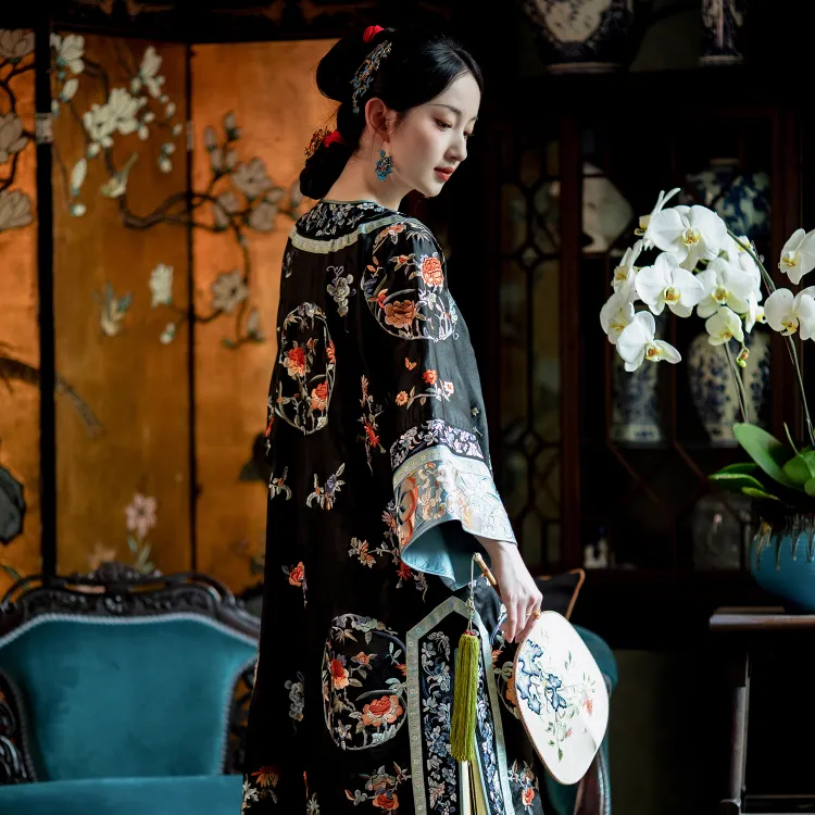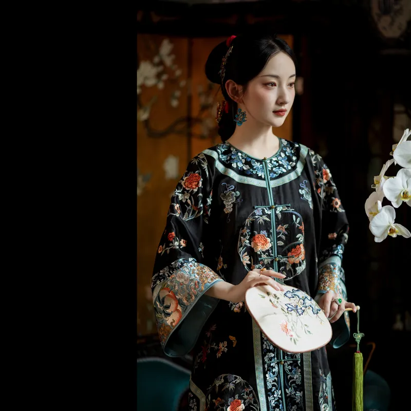 YICHENGFENGXU Ханьфу Женские Черный Full Вышитая версия Круглый Узор Qing Han Женские Передняя планка Халат и Плащ