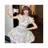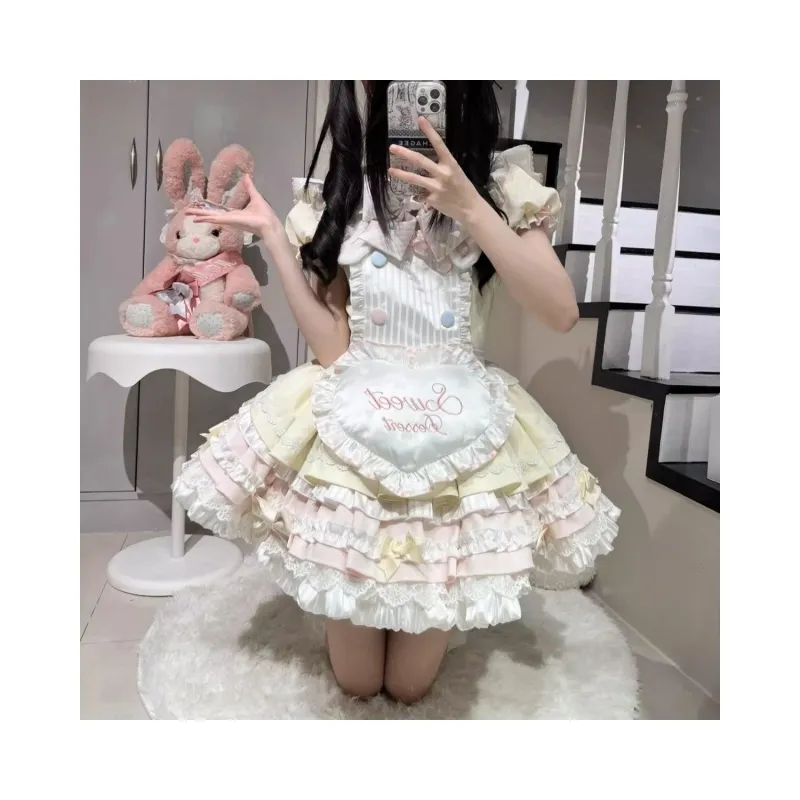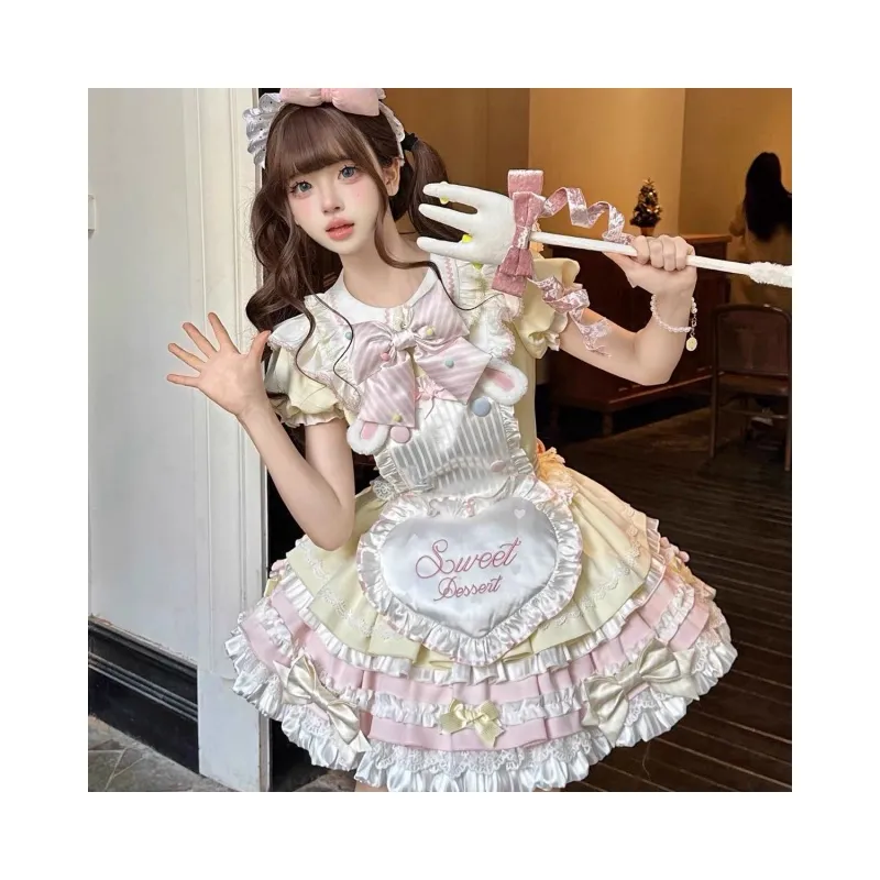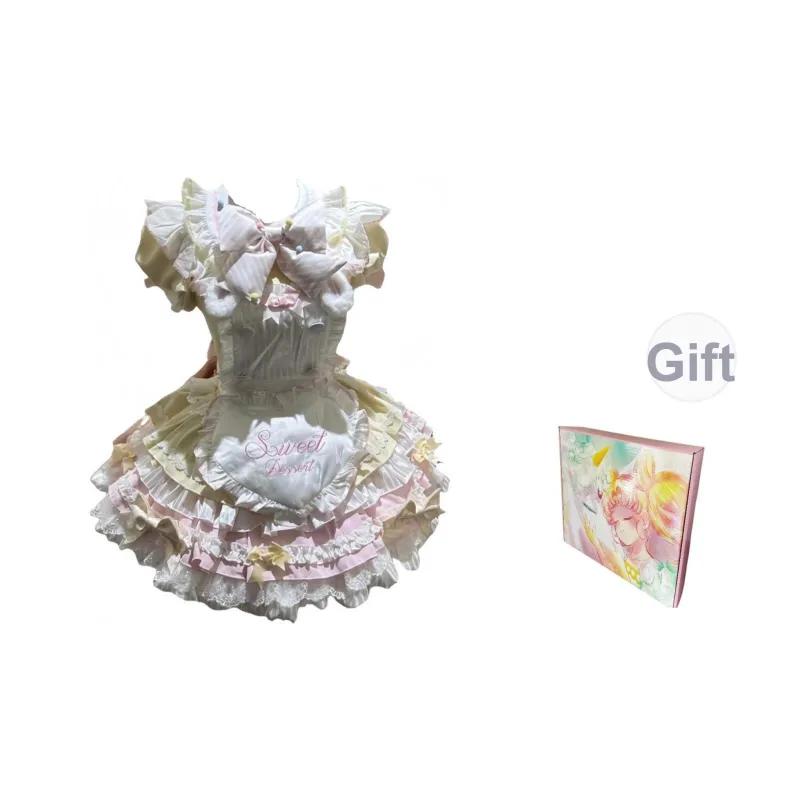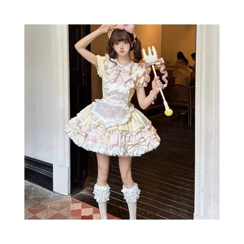 Цвет:Дофаминовая одежда Розовый Желтый + Фартучок + Двухслойный Большой Бант + Шляпа в виде мороженого