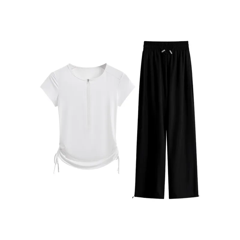 Йога Комплект На открытом воздухе MORNING RUN Альпинизм Велосипедная одежда Женские 2 предмета Комплект Белая Рубашка + HIGH RISE Широкие Штаны