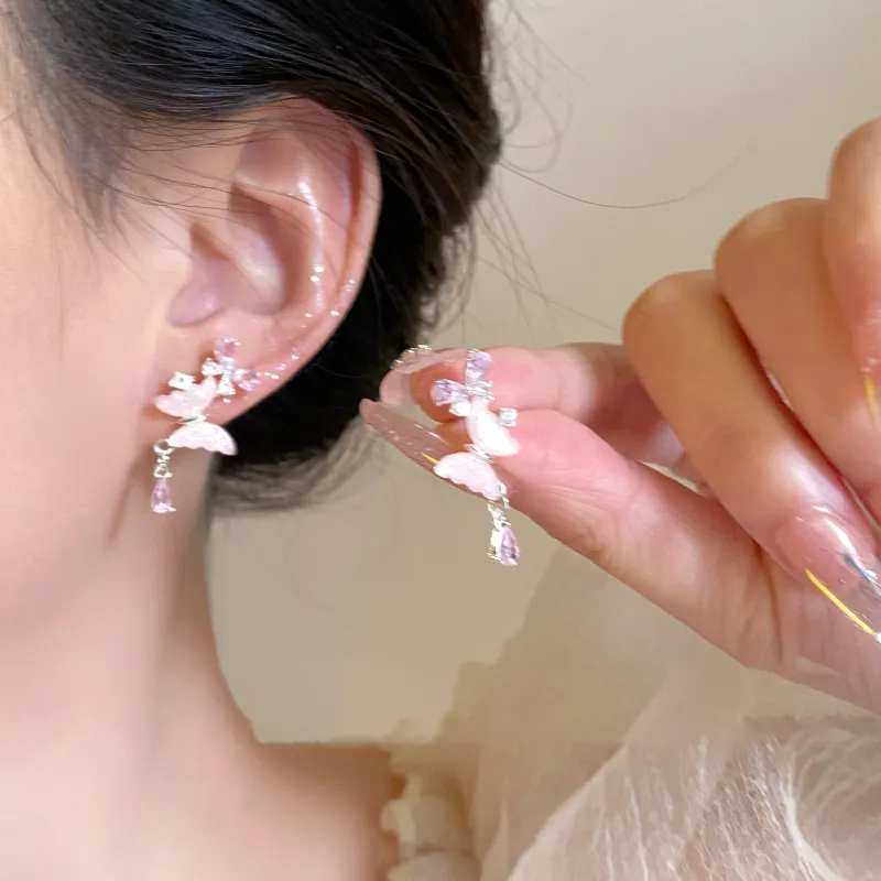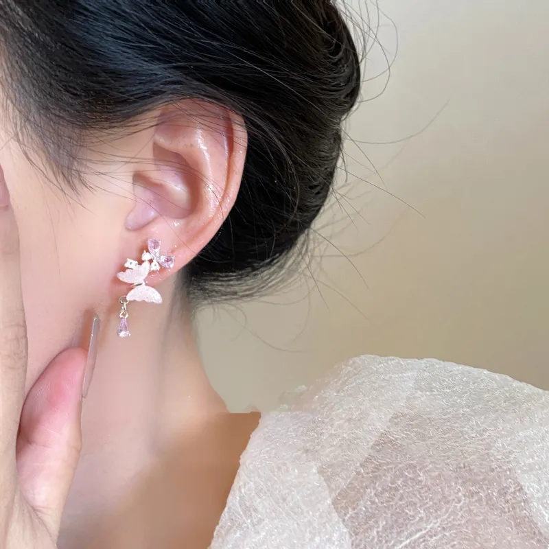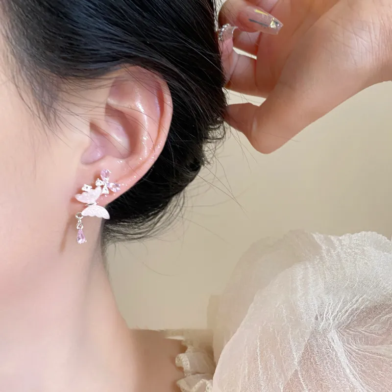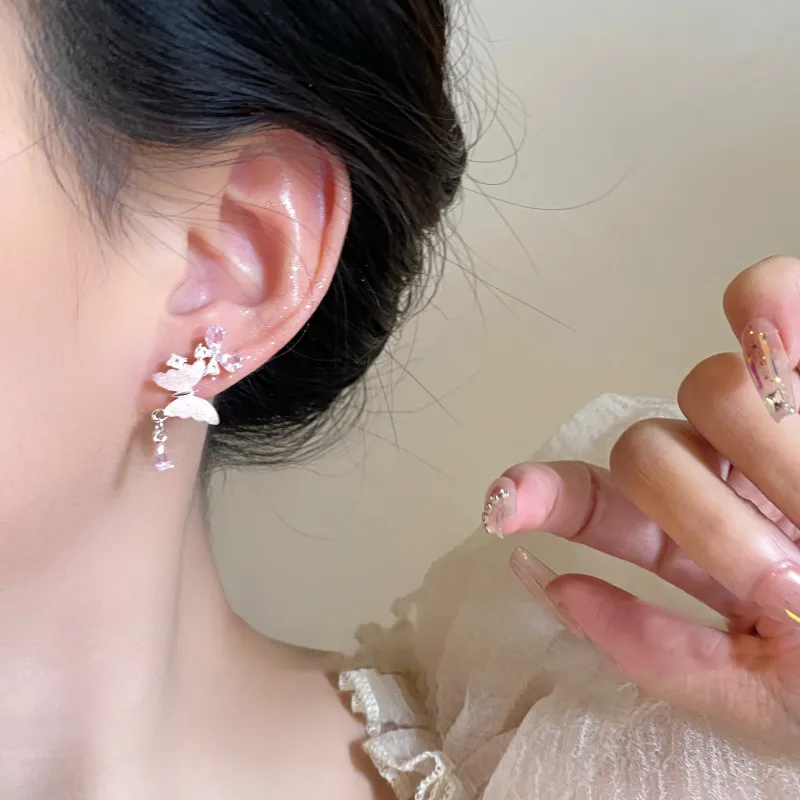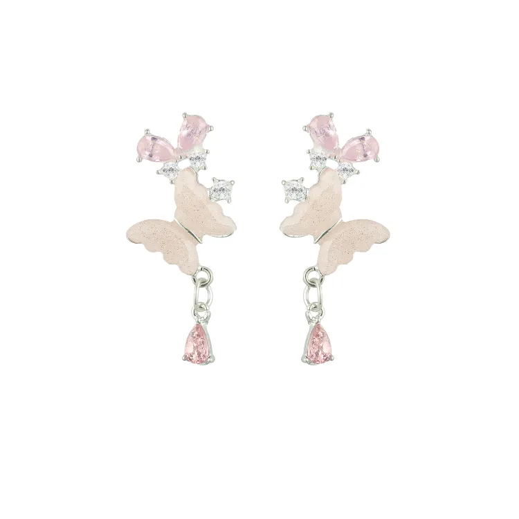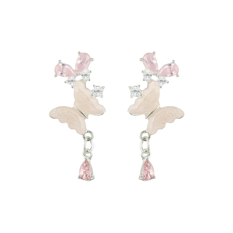 Стиль:Розовый оттенок Крем, Серьги с бабочкой, Серебряная игла