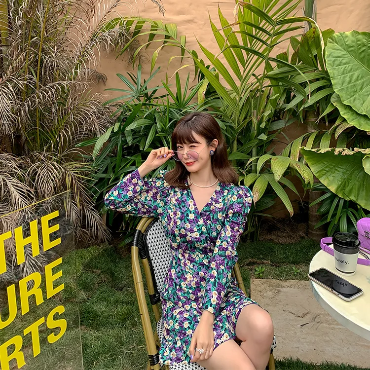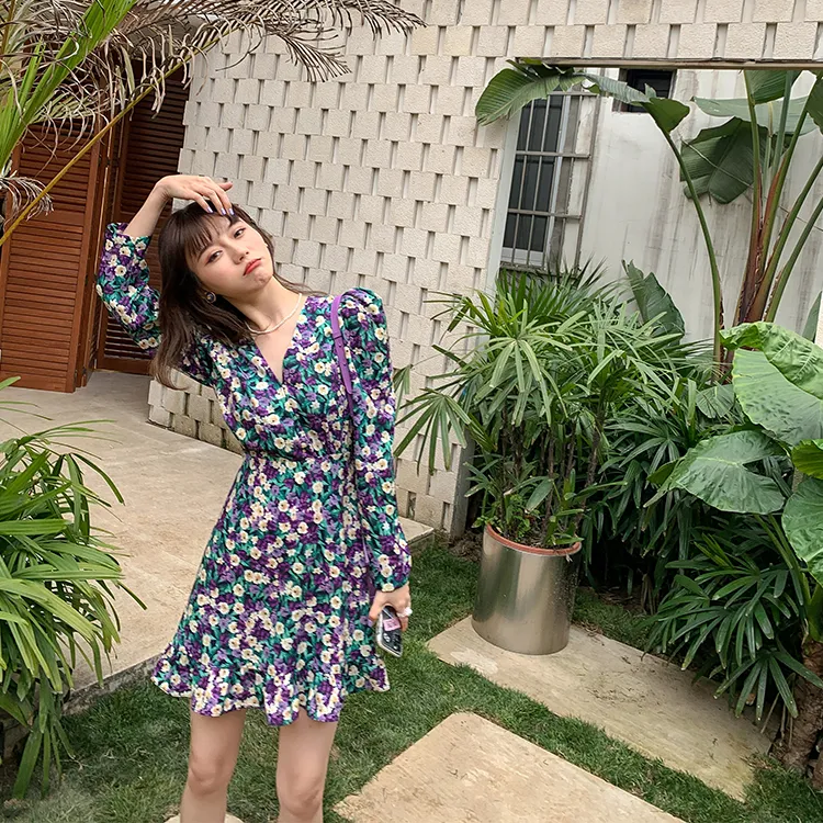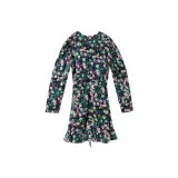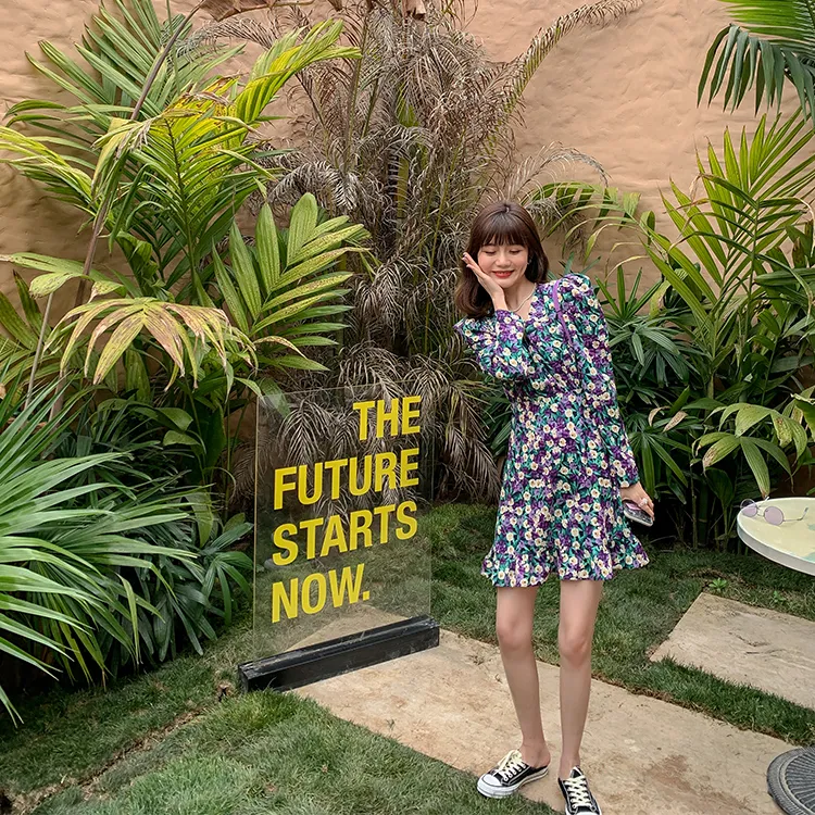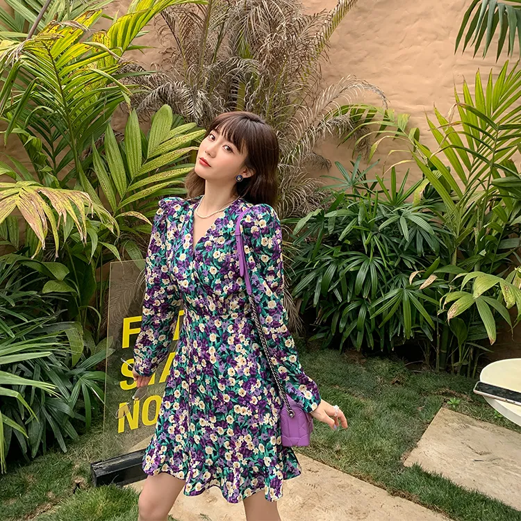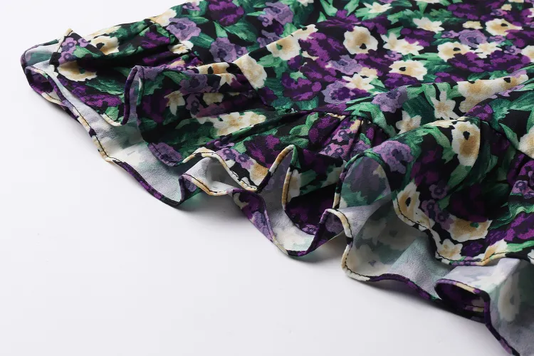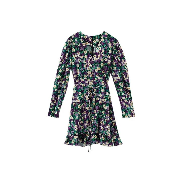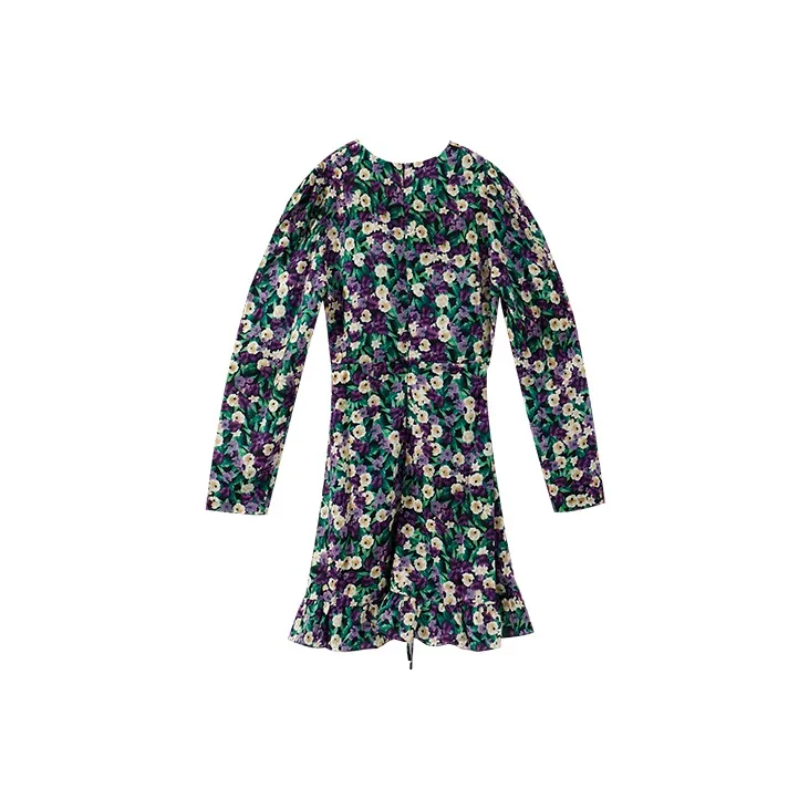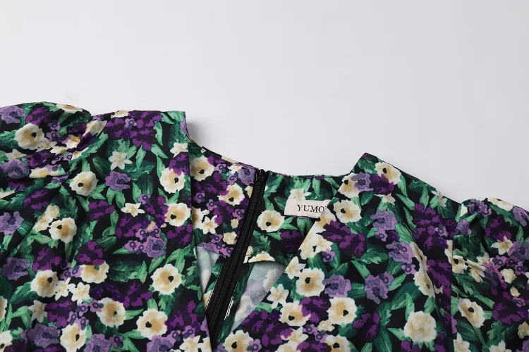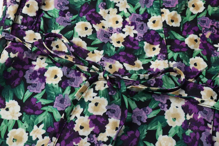 YUMOMO STAR Черная Основа с Желтыми и Фиолетовыми Цветами Женское Длинное Платье с Рукавами