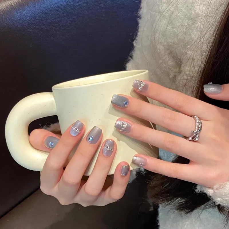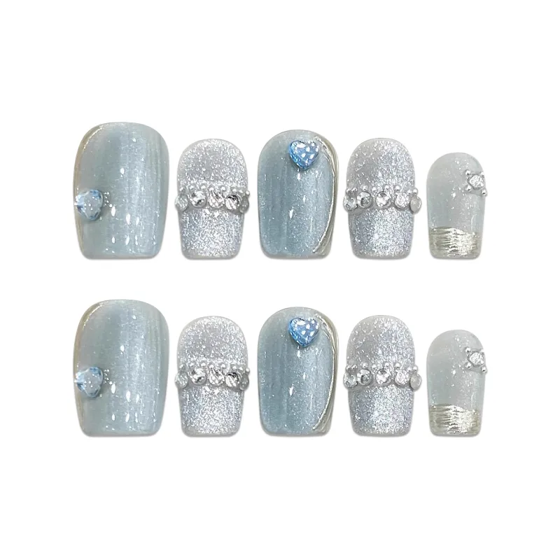 Yun Yue Joe Синий Кошачий глаз Ручной Сверкающий страз Осветляющий False Nail Короткий LADDER 15 мм