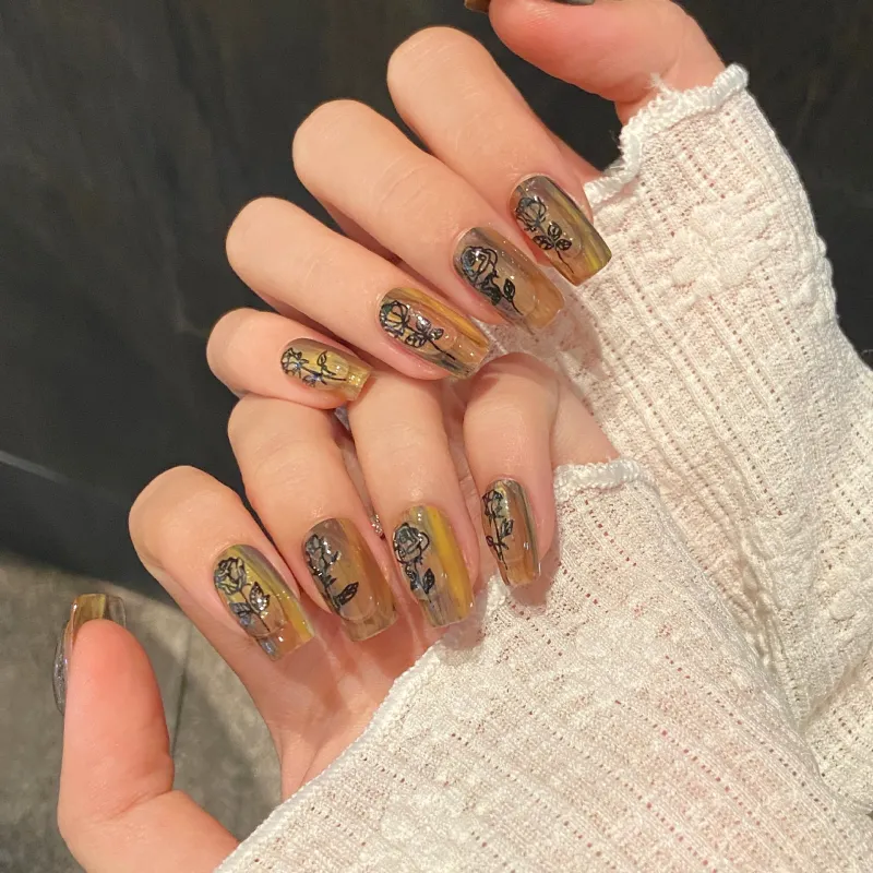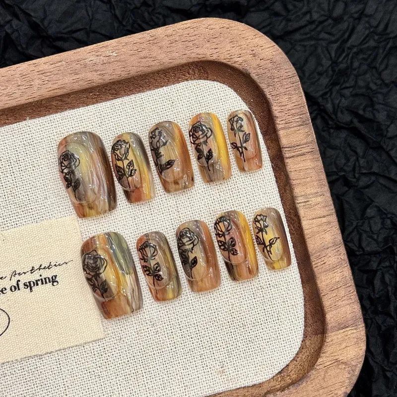 YUNYUEQIAO Deep Розовый Сушеная роза Масляная живопись Осветляющий Премиум Утонченный Укороченный Handcrafted False Nail