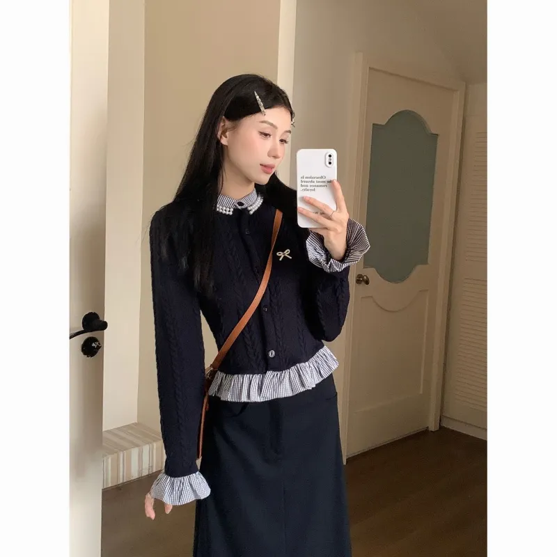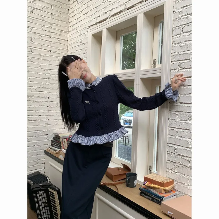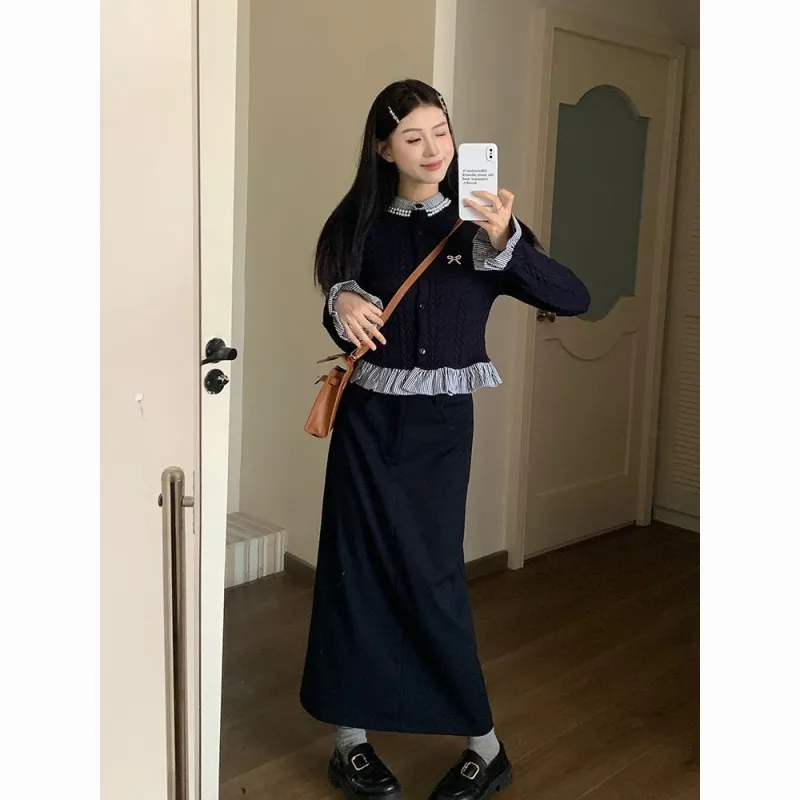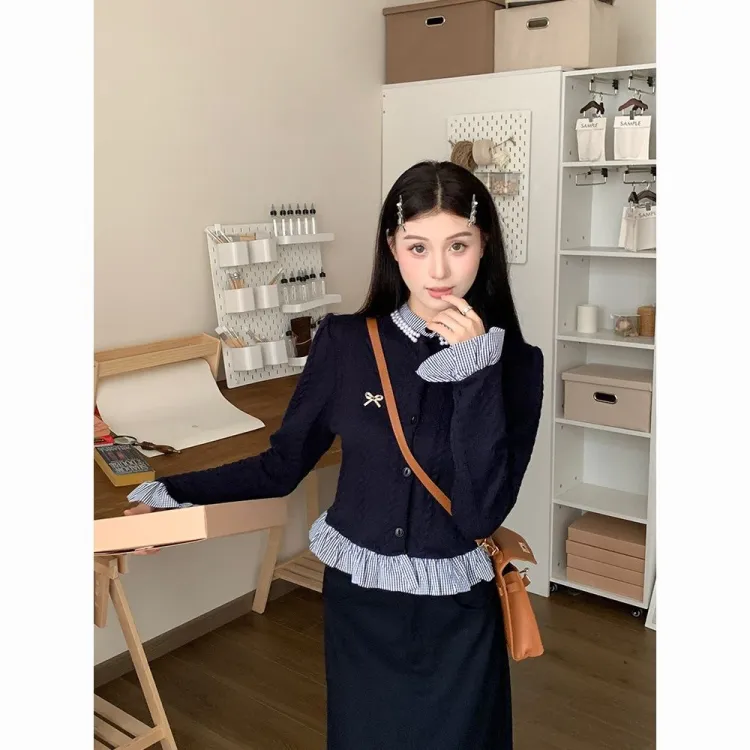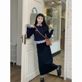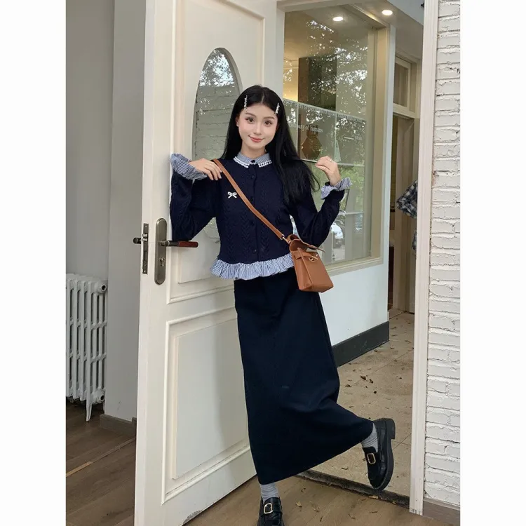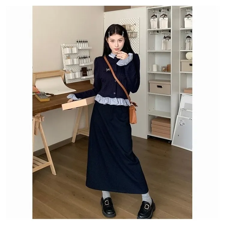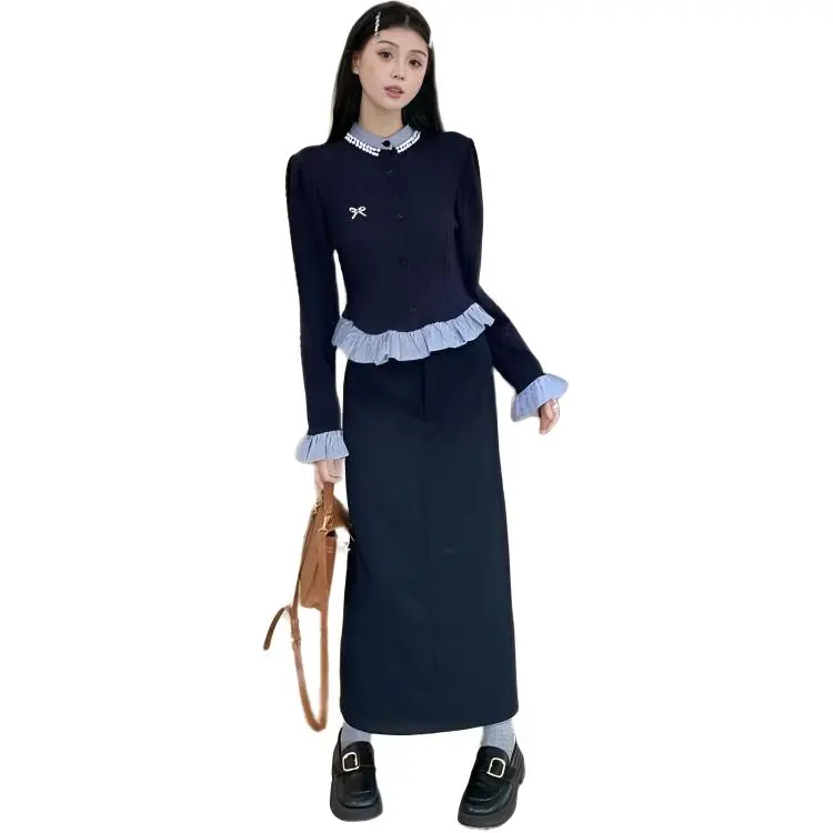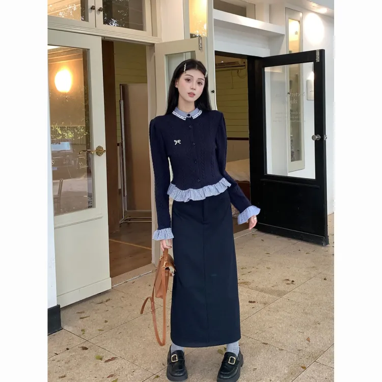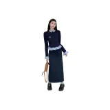 Комплект:Имитация двухслойности Трикотаж + Брошь + Юбка [Двухкомпонентный комплект]